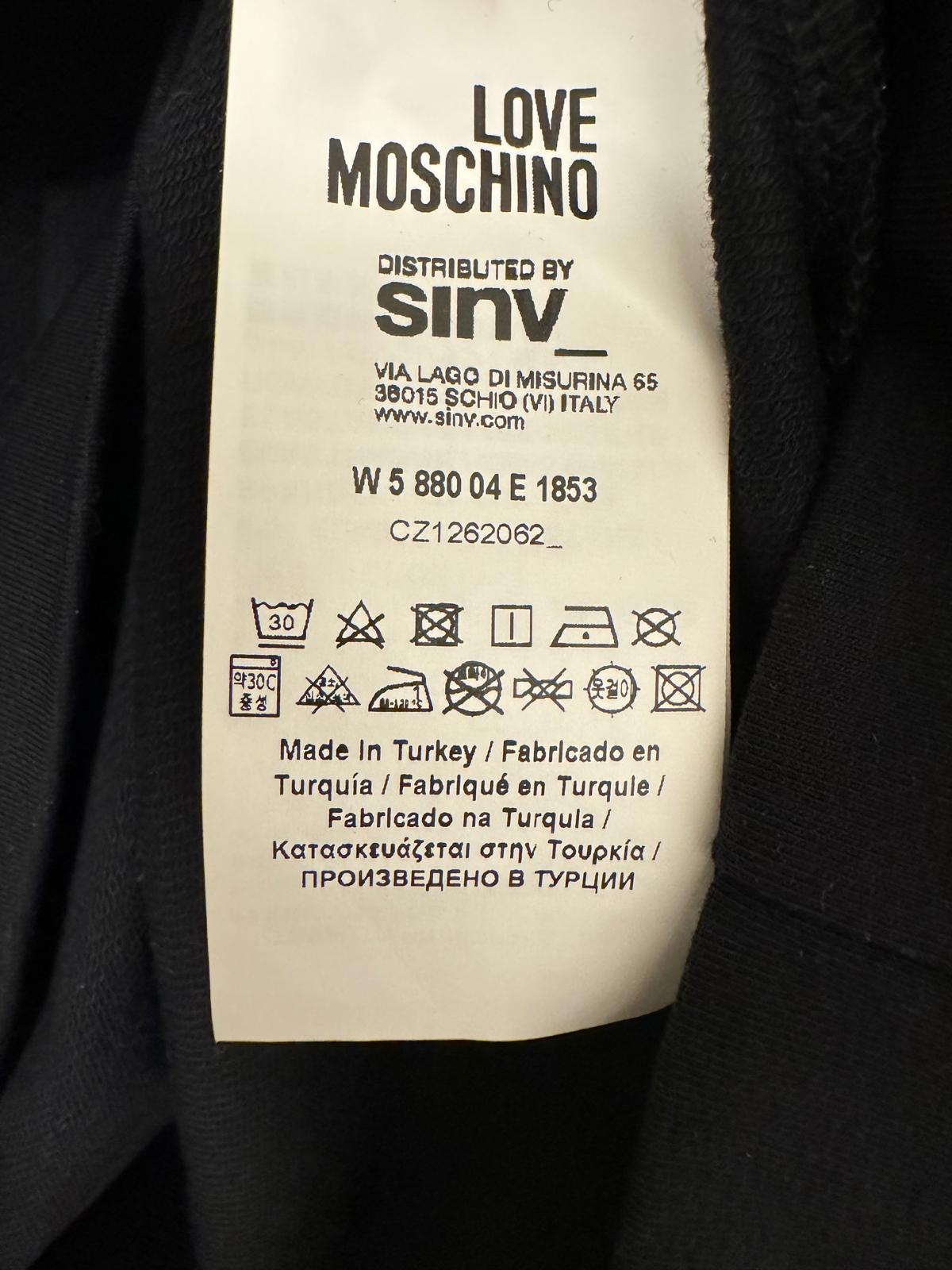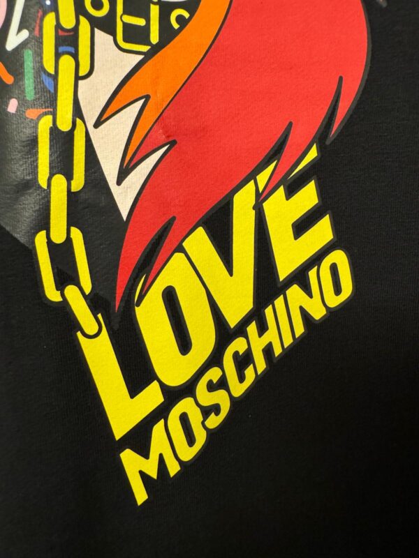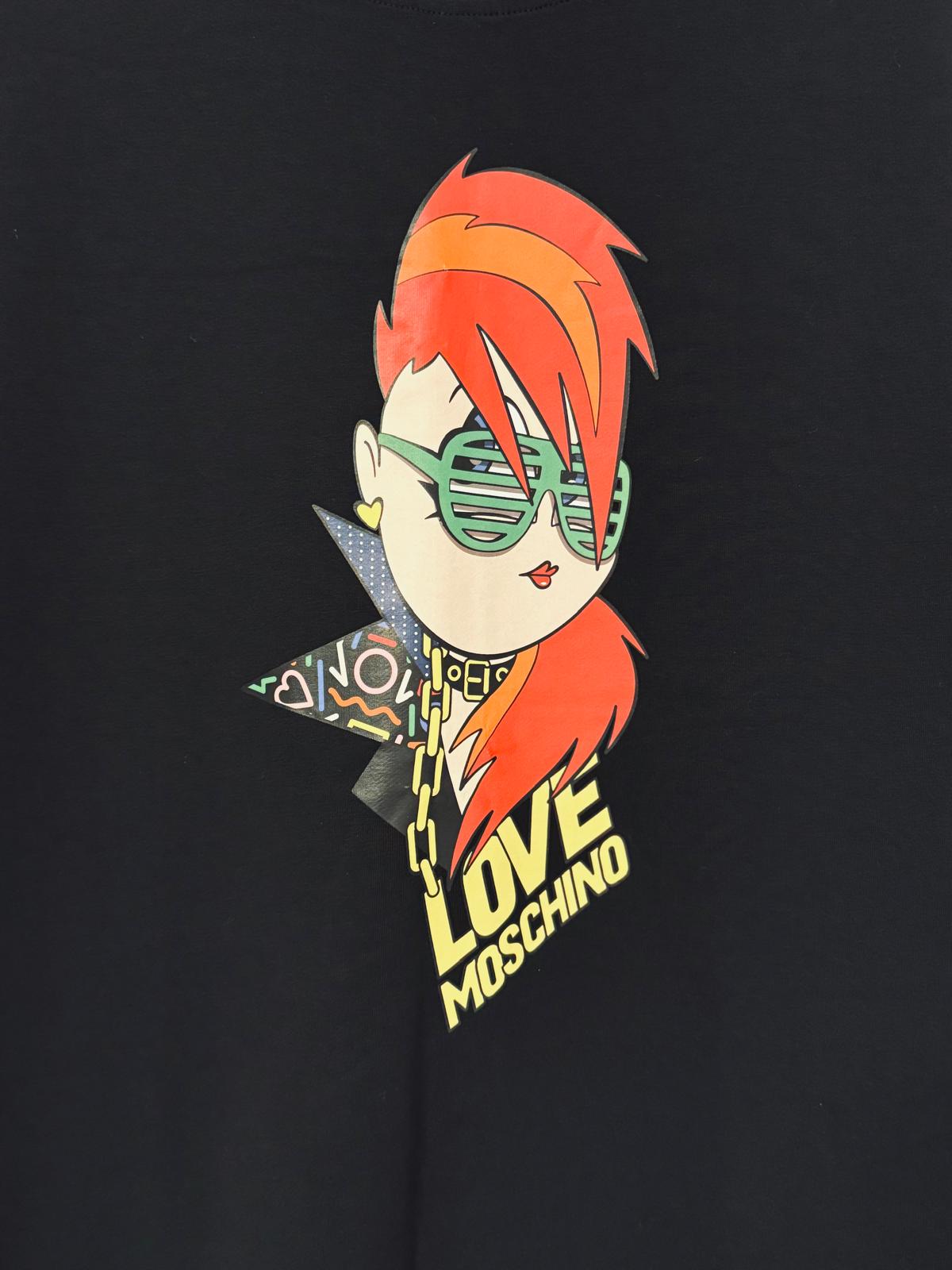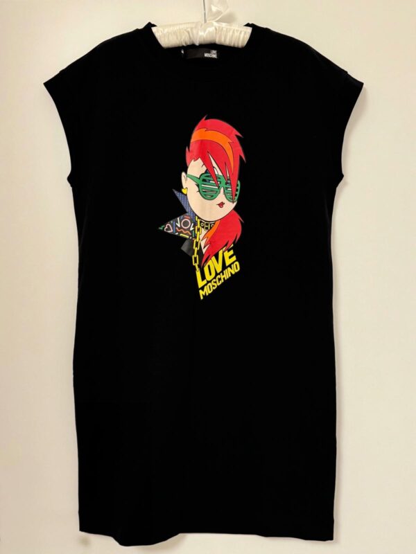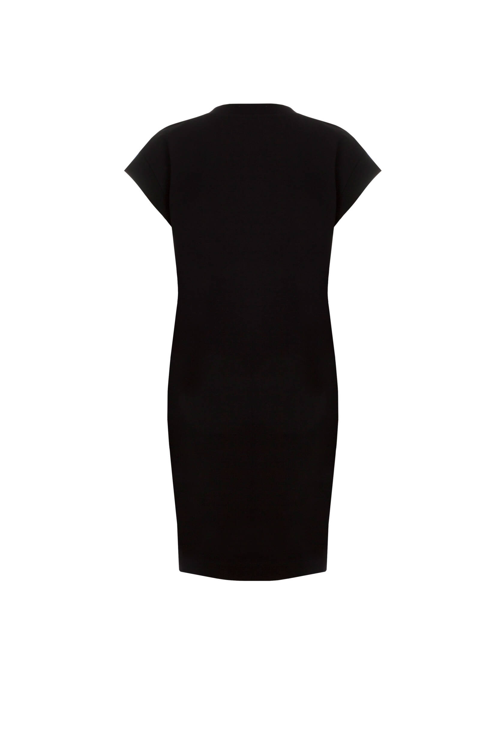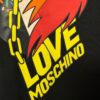 Czarna sukienka Love Moschino o prostym fasonie 'Regular Fit’. Dekolt typu o-neck oraz rękawy zakończone prążkowanym ściągaczem. Z przodu kolorowy nadruk z nazwą marki.