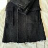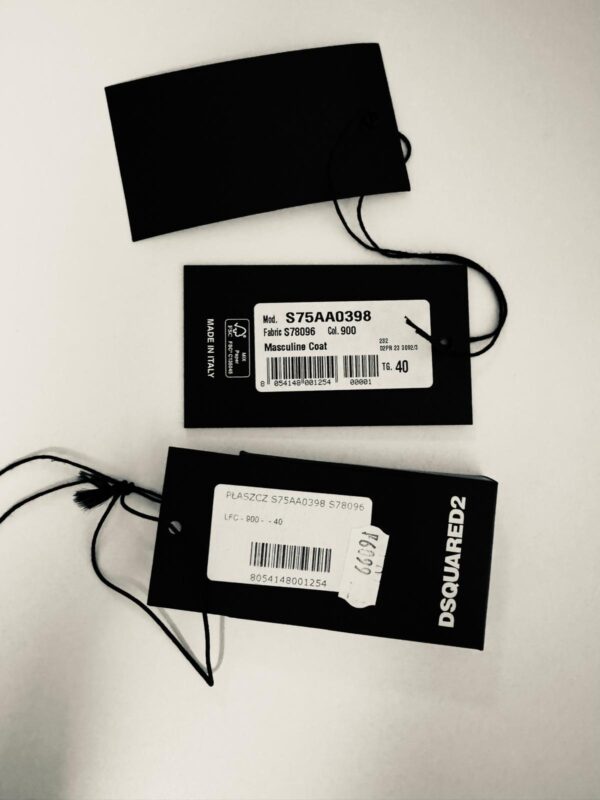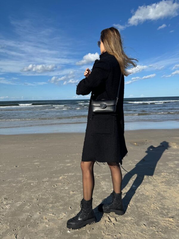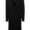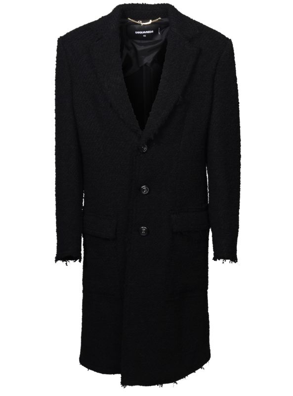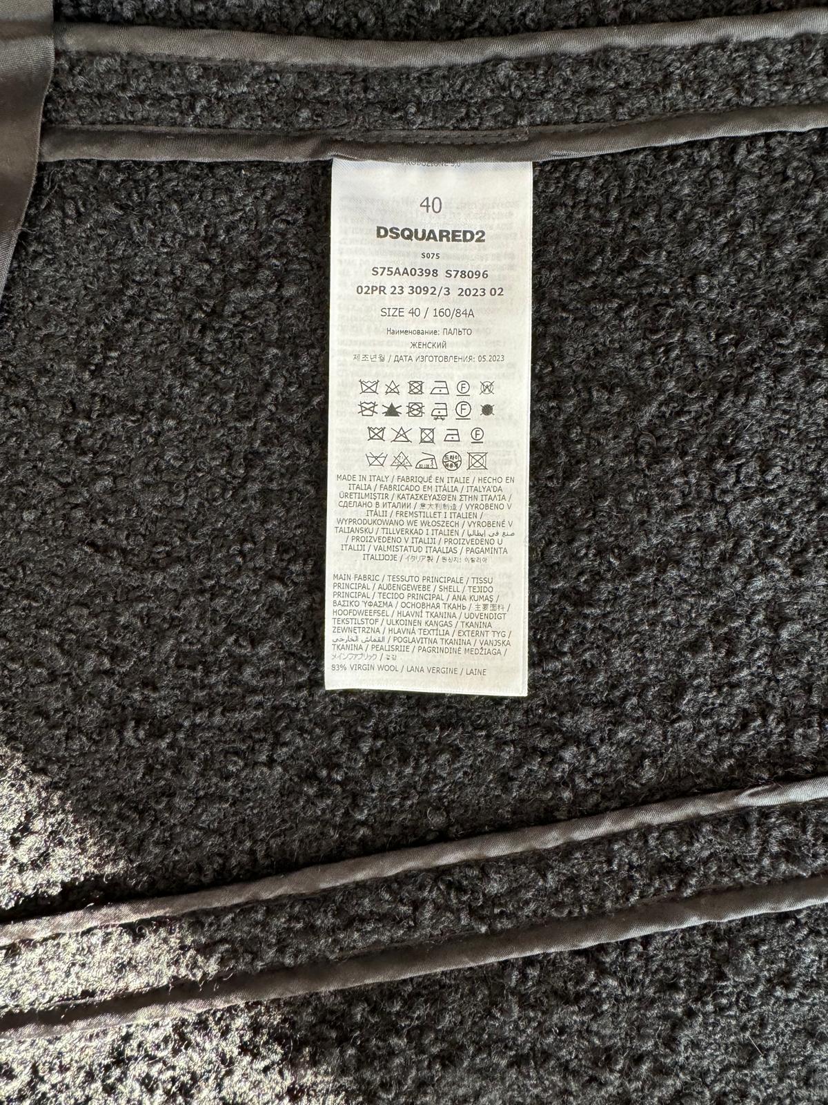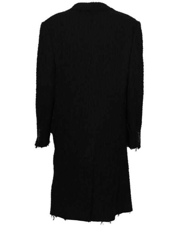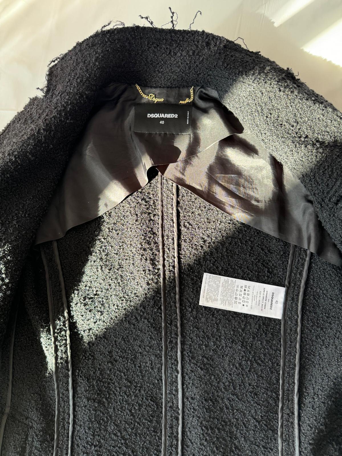 Czarny płaszcz Dsquared2. Wykonany z wełny. Zapinany na guziki. Dwie kieszenie z patkami. Otwarte klapy. Długie rękawy. Górna część płaszcza (górna część pleców oraz rękawy) dodatkowo wzmocniona wszytą podszewką. Model unisex.