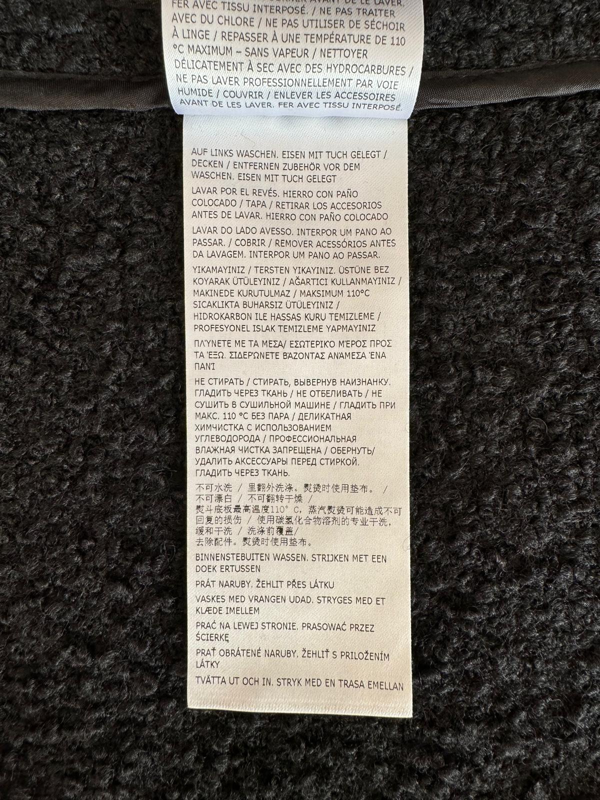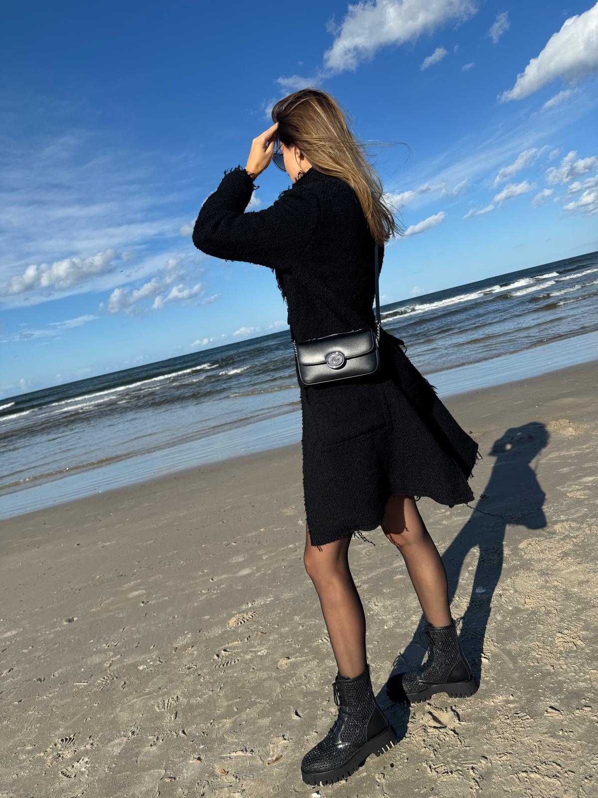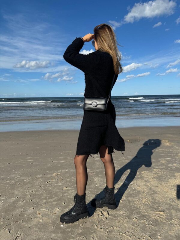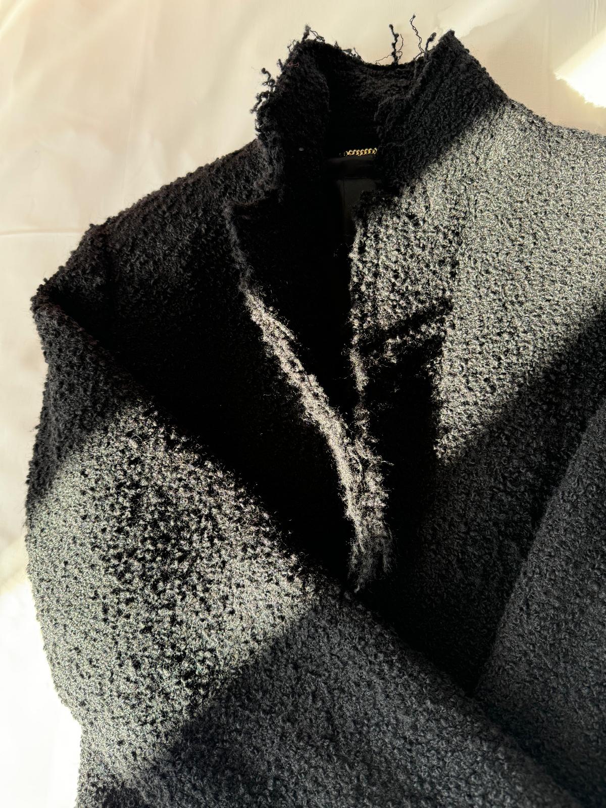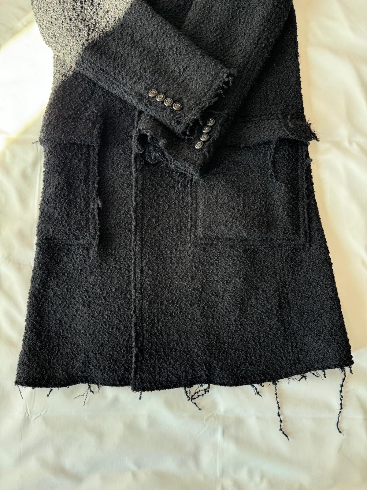 Czarny płaszcz Dsquared2. Wykonany z wełny. Zapinany na guziki. Dwie kieszenie z patkami. Otwarte klapy. Długie rękawy. Górna część płaszcza (górna część pleców oraz rękawy) dodatkowo wzmocniona wszytą podszewką. Model unisex.