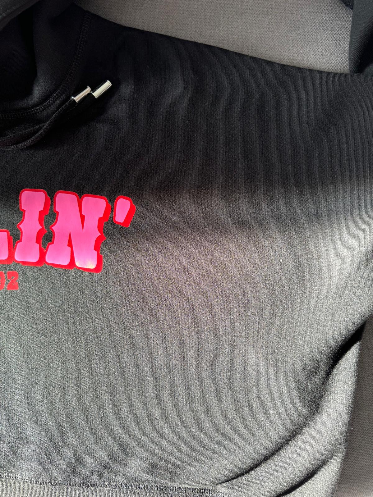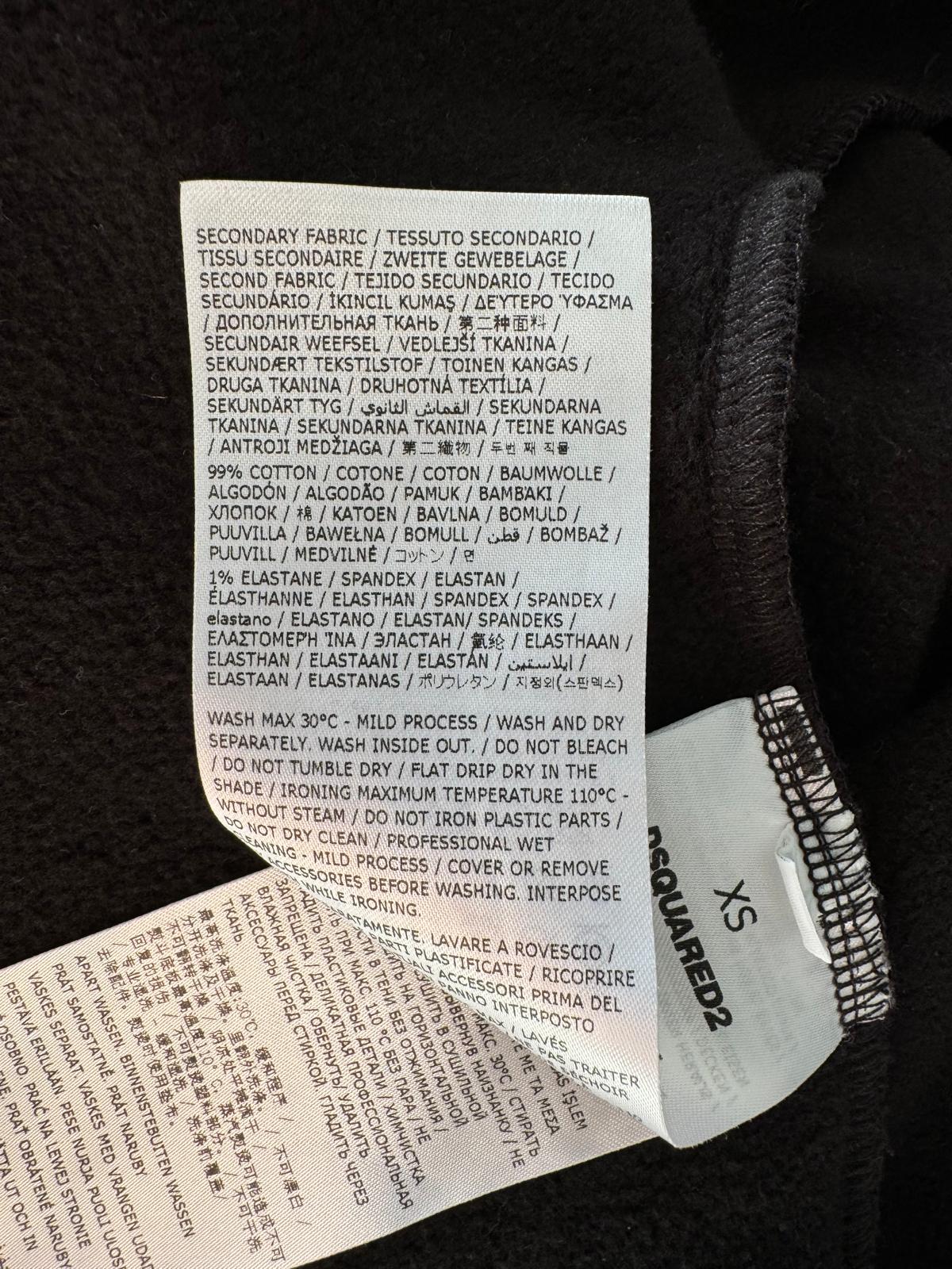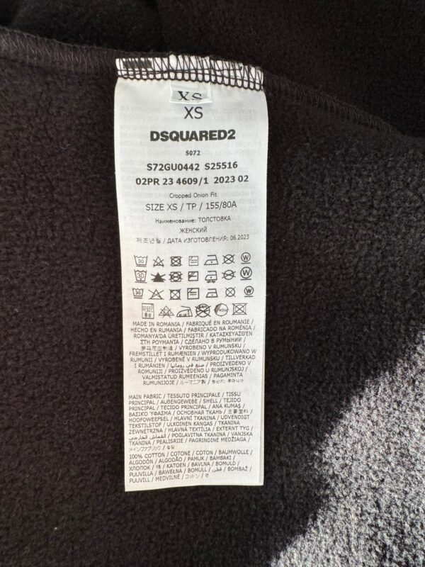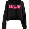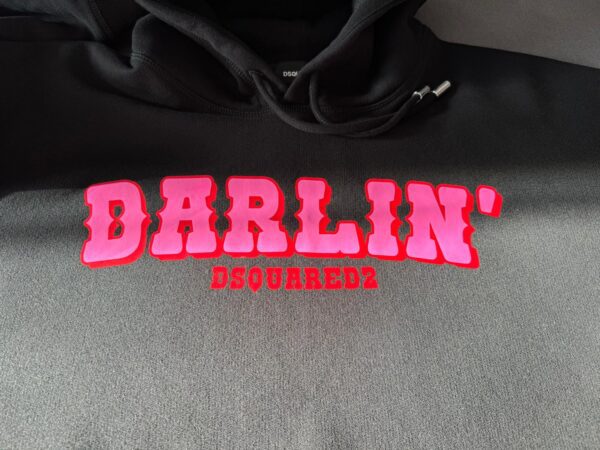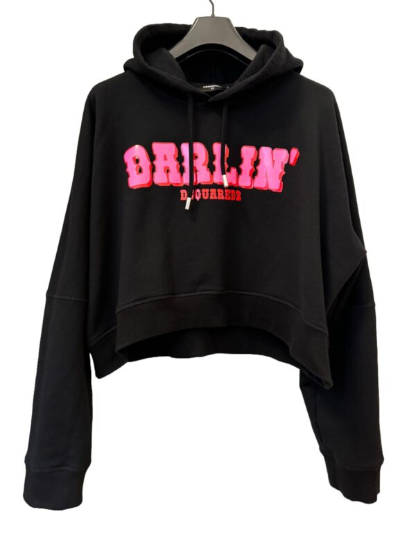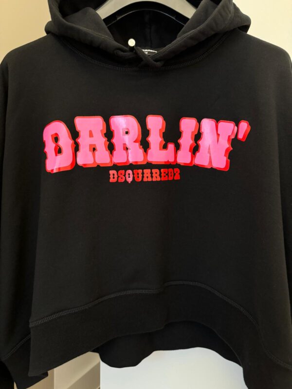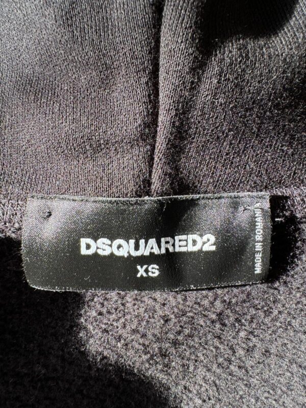 Czarna, bawełniana bluza Dsquared2. Kaptur ściągany trokami. Z przodu ozdobiona nadrukowanym wzorem z logo w kolorze czerwono-różowym. Długie rękawy i dół zakończone ściągaczem.