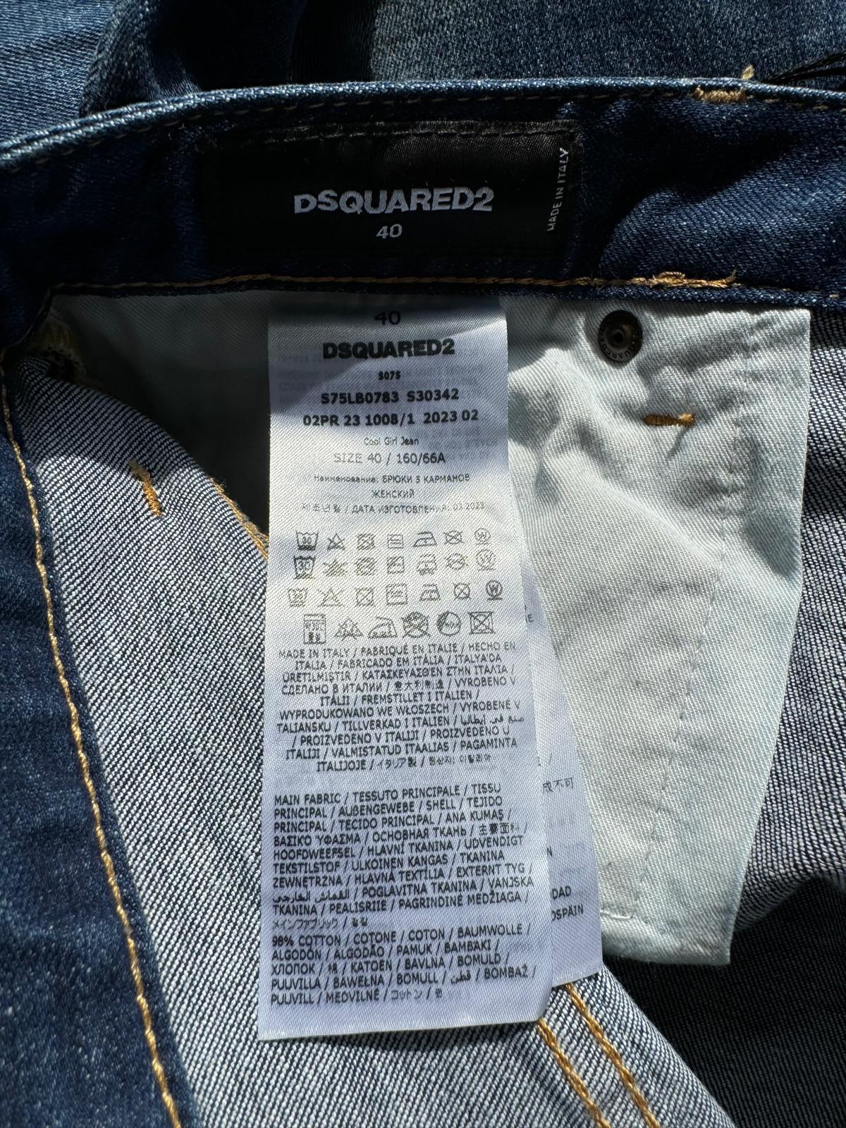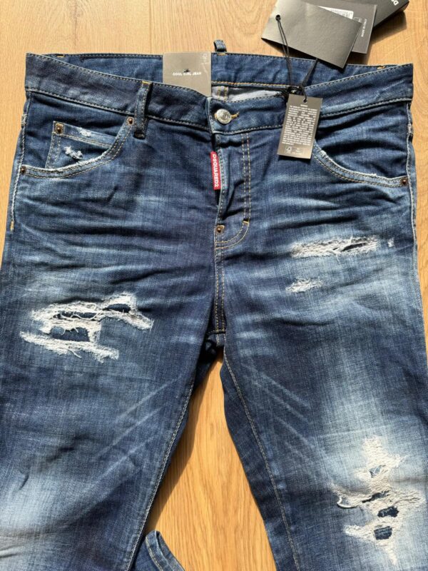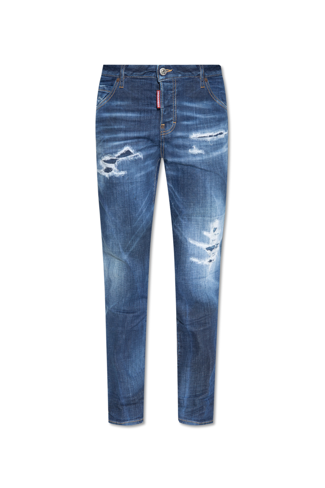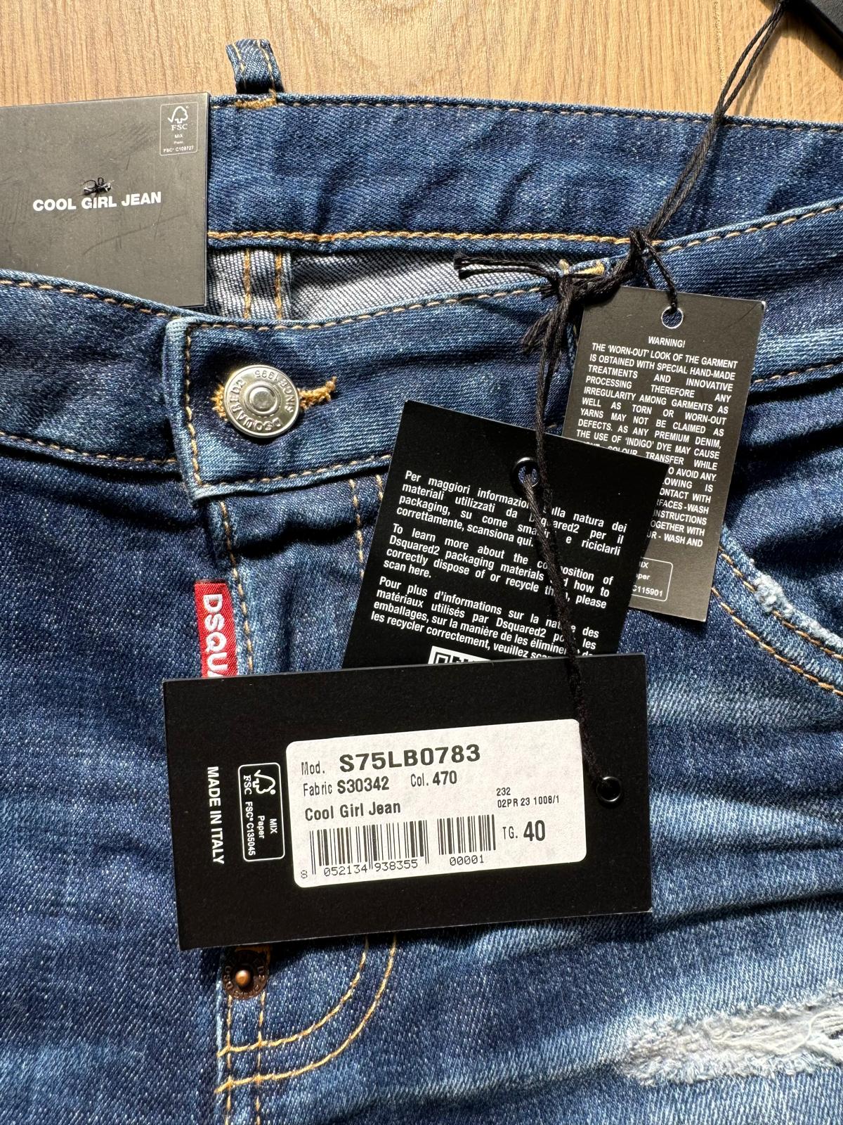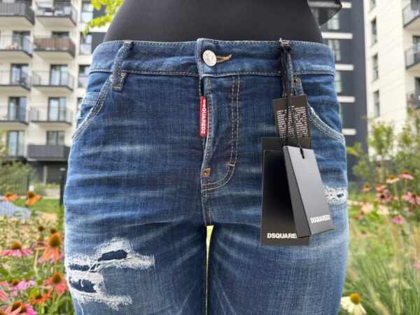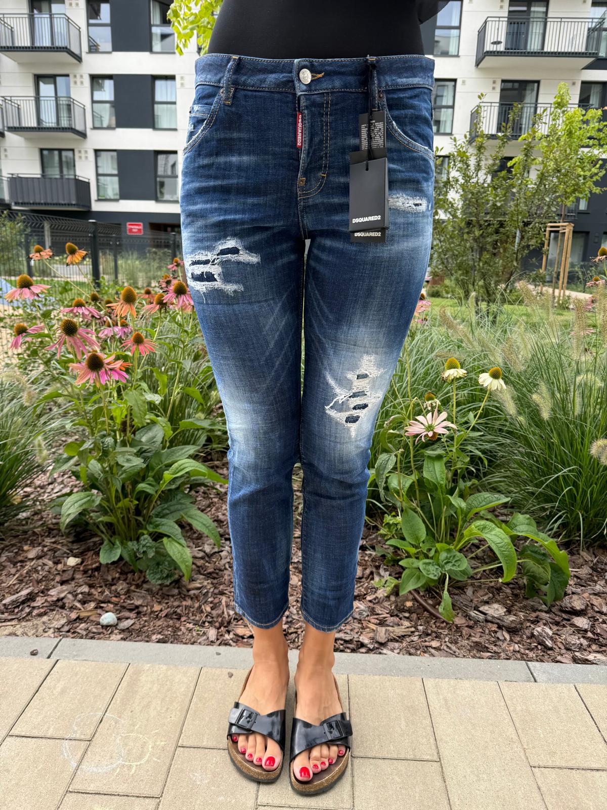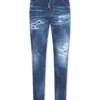 Granatowe, dopasowane jeansy „Cool Girl” od Dsquared2. Wykonane z efektem przetarcia, zapięcie na guziki, klasyczne kieszenie oraz naszywki z logo producenta.
