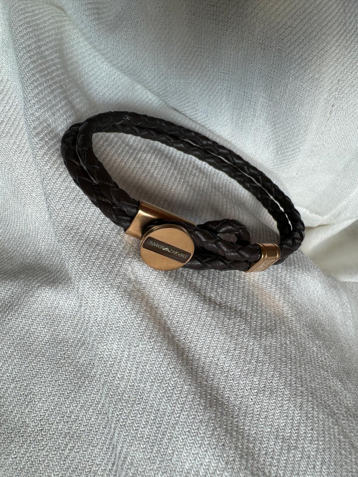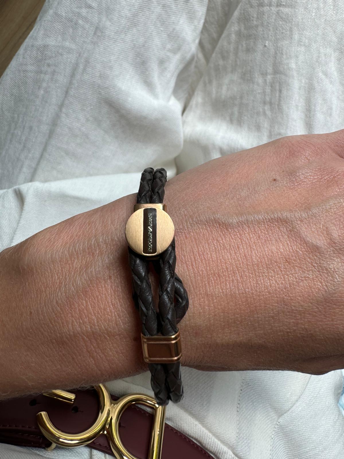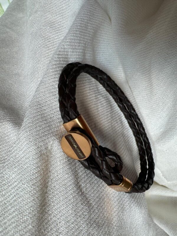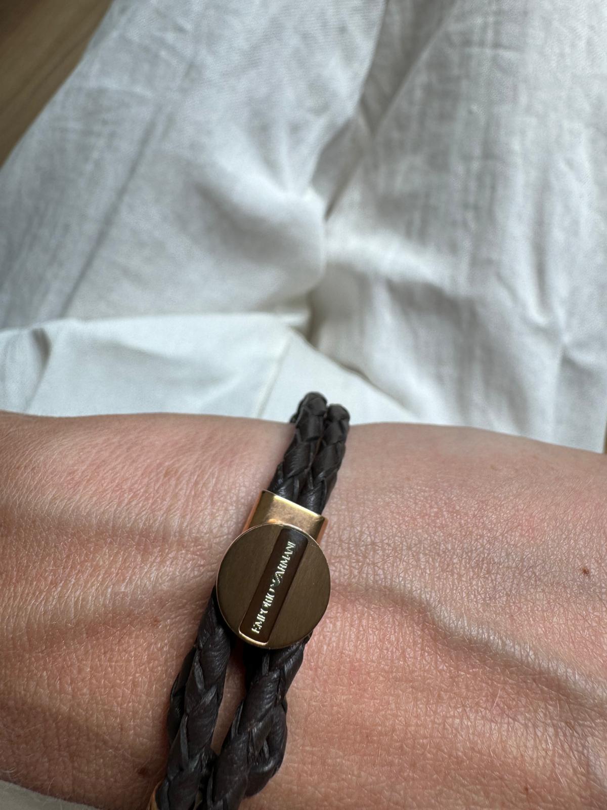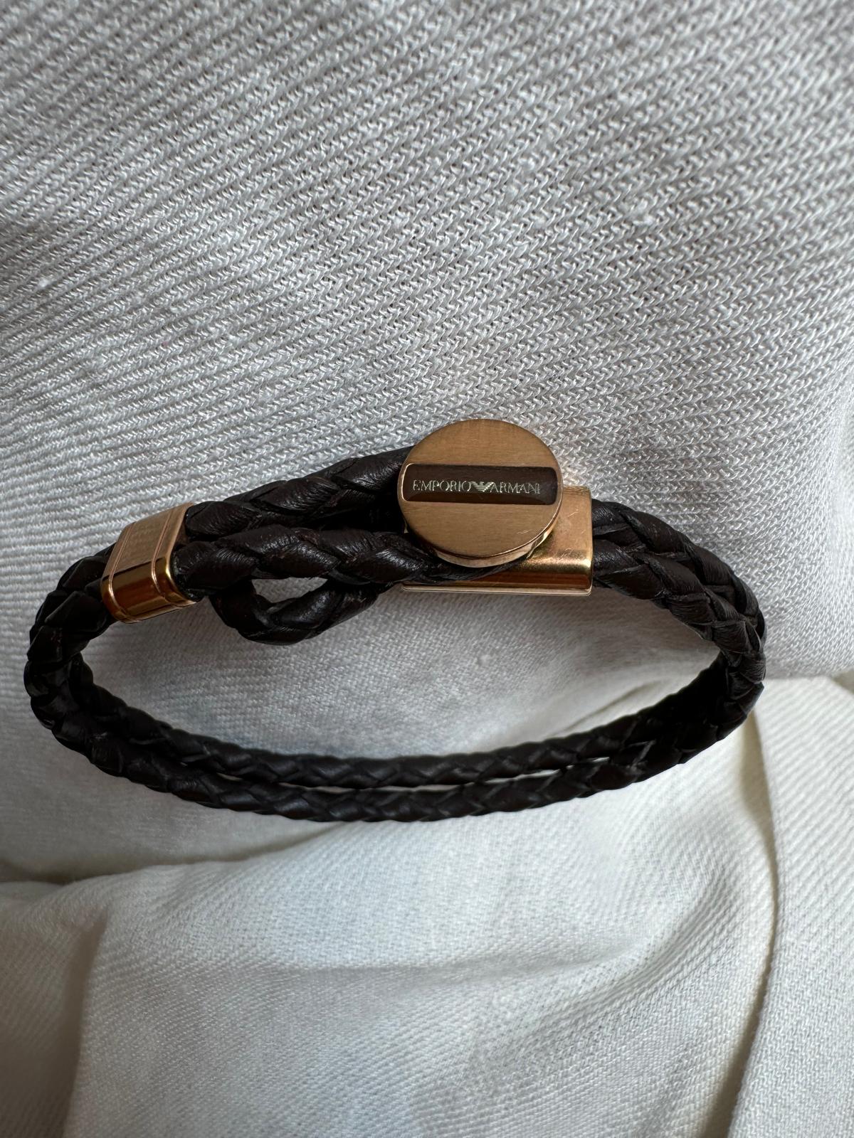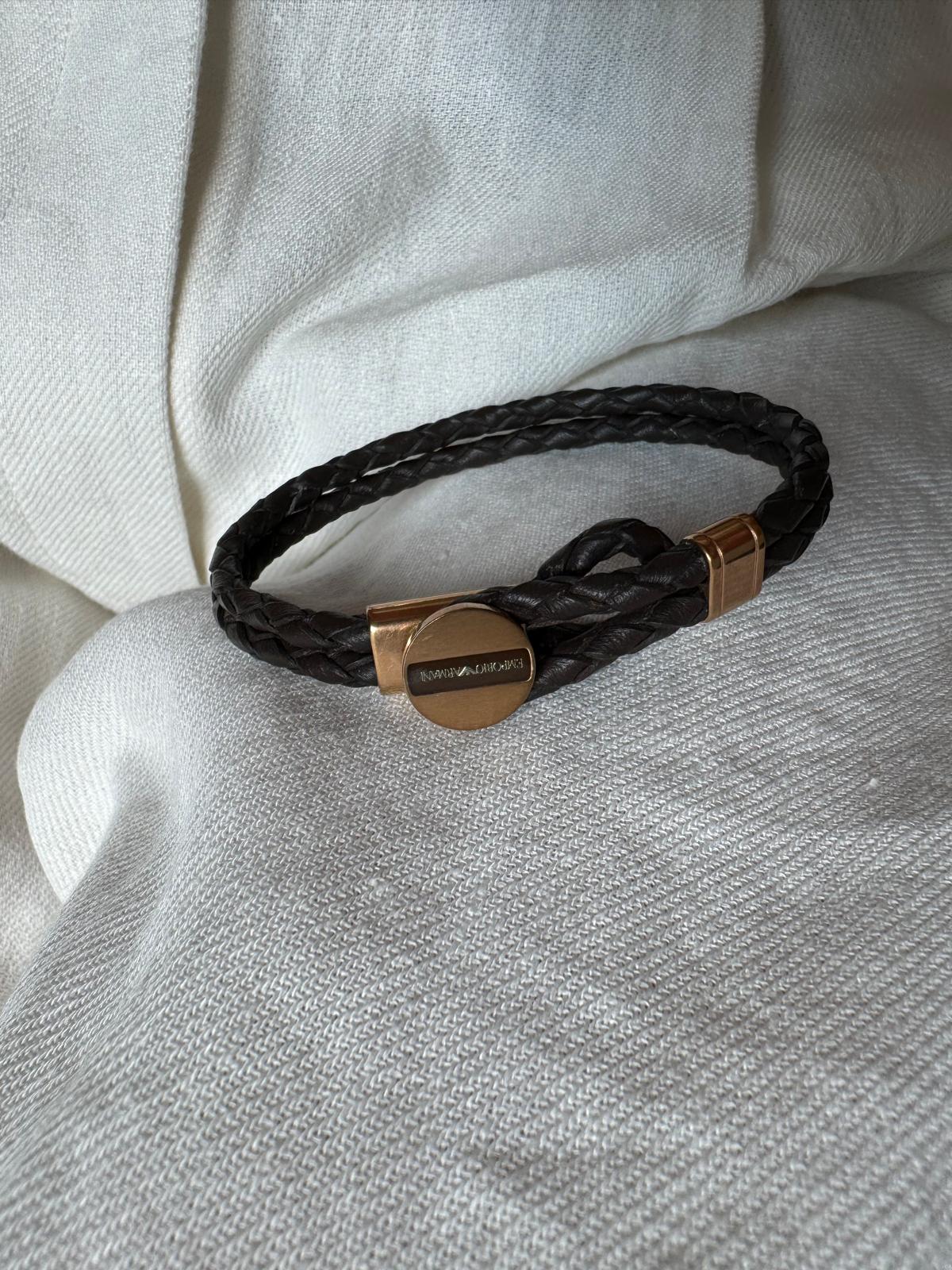 Bransoletka z kolekcji Emporio Armani. Model wykonany z połączenia skóry naturalnej i metalu. Kolor brązowy ze złotymi dodatkami.