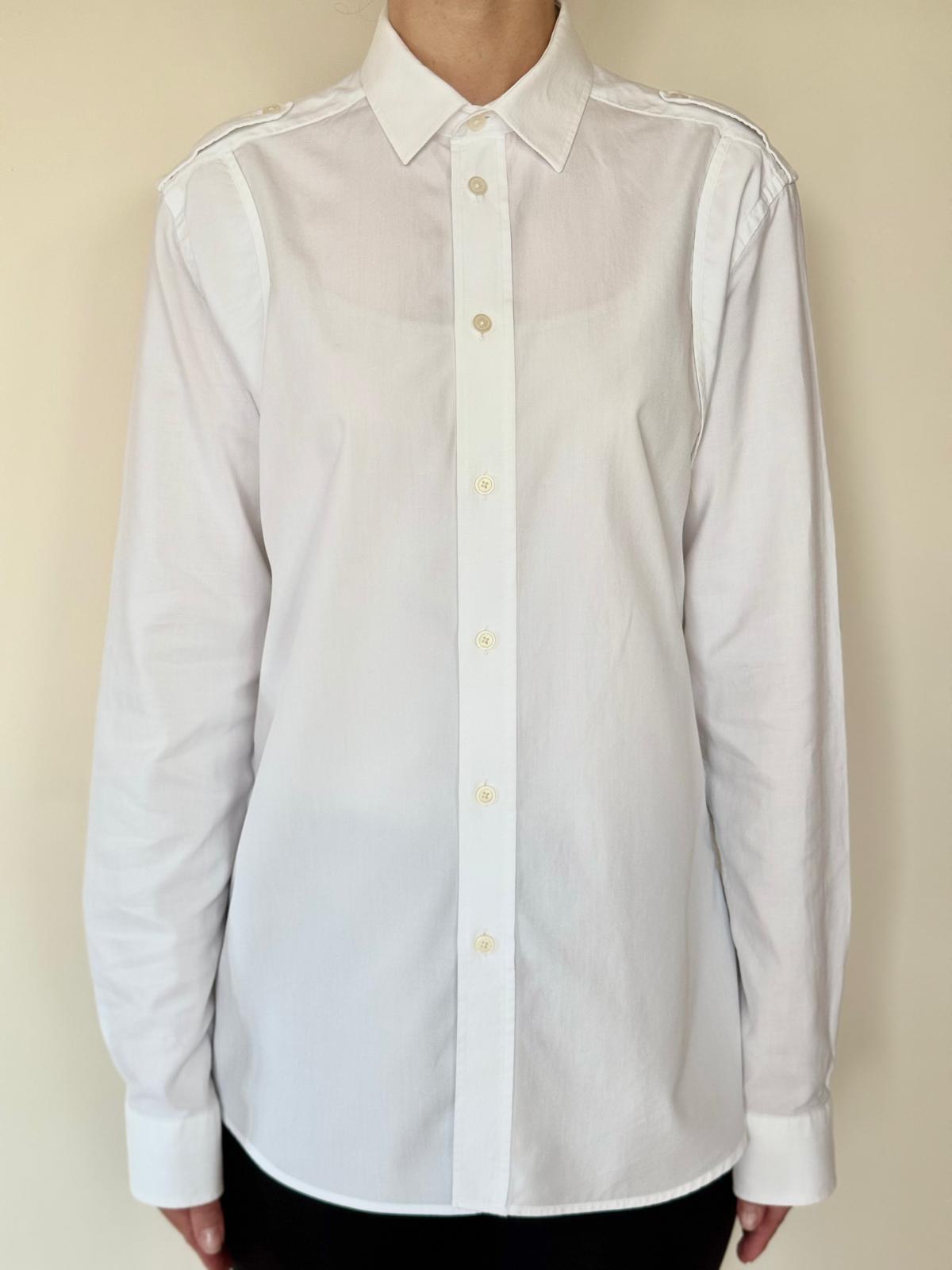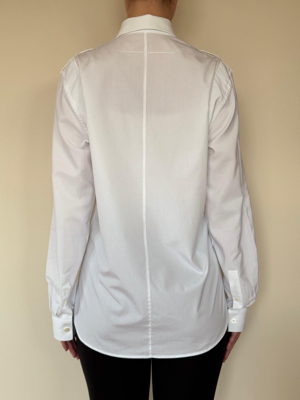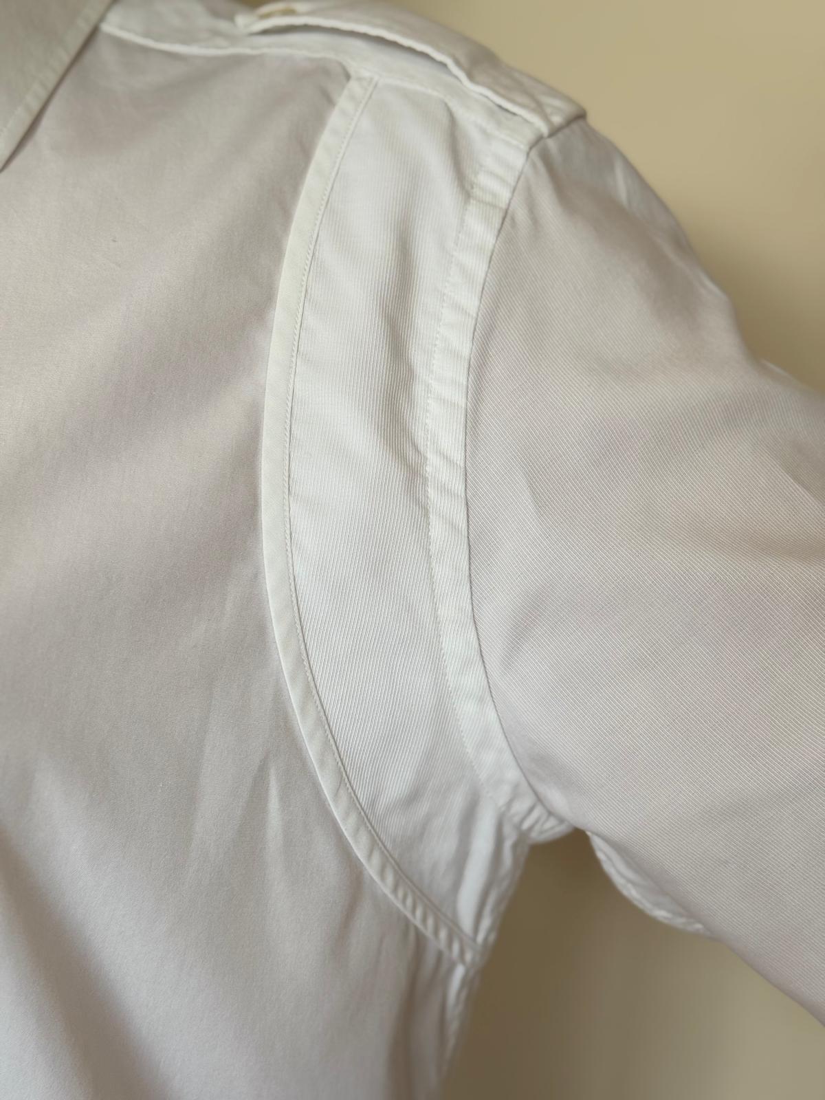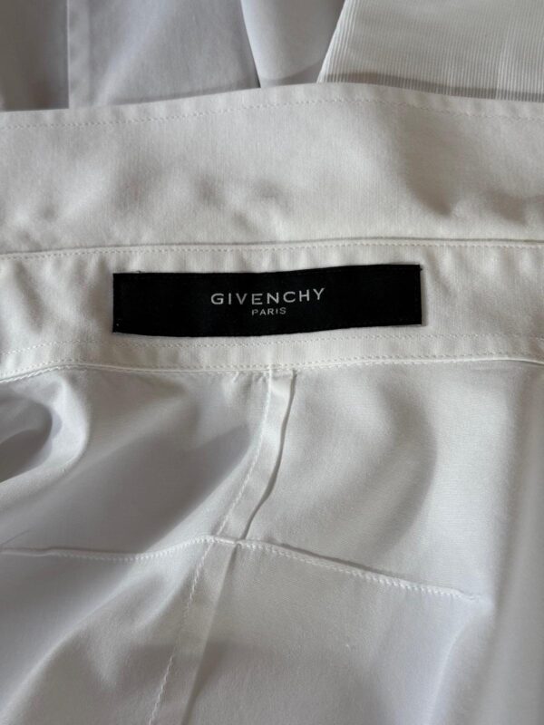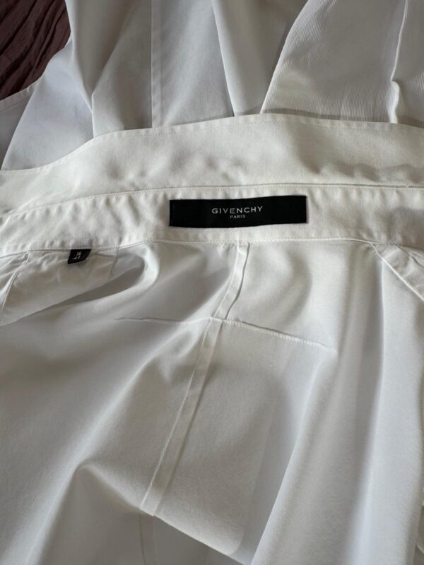 Koszula z długimi rękawami wykonana z bawełny. Jest to wysokiej jakości produkt od Domu Mody Givenchy, który posłuży Ci przez wiele sezonów. Koszula o klasycznym kroju lecz w nowej odsłonie – z prostym kołnierzykiem, pagonami i efektownymi wstawkami przy rękawach. Z tyłu koszuli poziome przeszycie na karku. Rękawy wykonano z nieco grubszej niż pozostała część koszuli prążkowanej popeliny. Guziczki z masy perłowej z nazwą marki. Bawełniana koszula jest idealnym wyborem zarówno na co dzień jak i do biura.