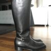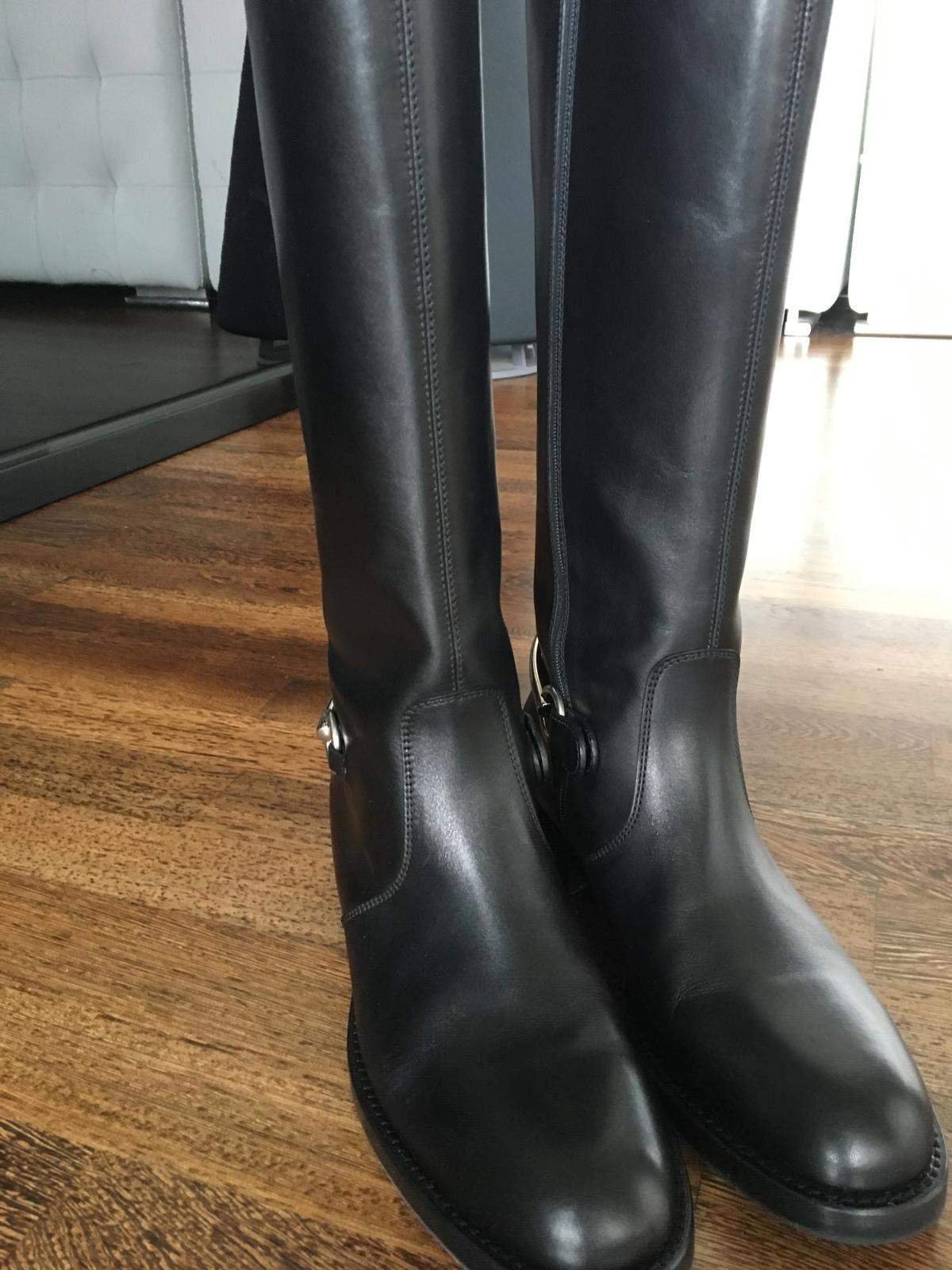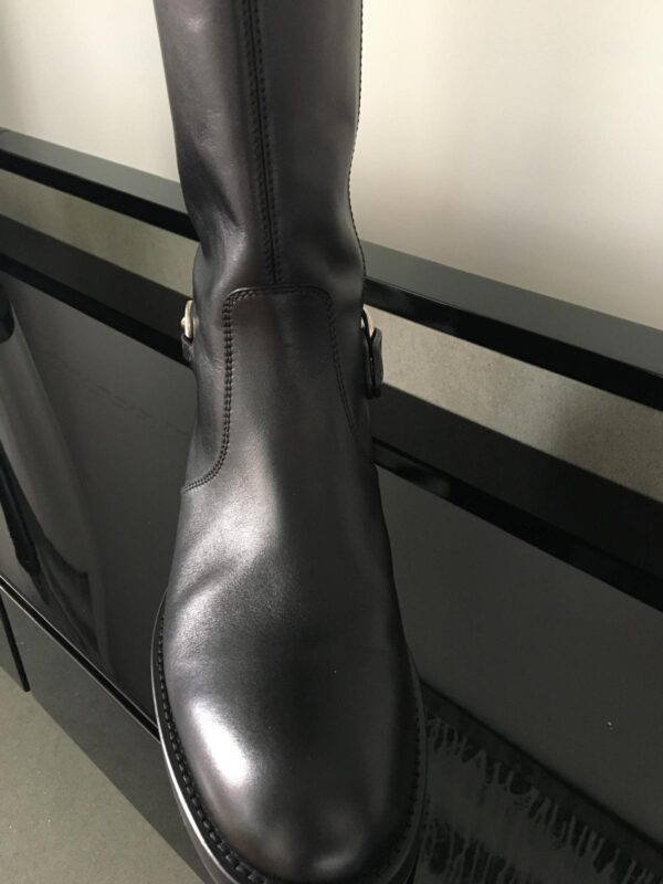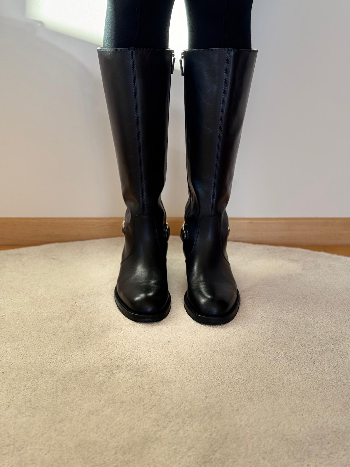 Skórzana cholewka osadzona jest na płaskiej skórzanej podeszwie z niskim szerokim obcasem, który jest wygodnym rozwiązaniem na jesienno-zimowe dni zapewniając stabilność oparcia. Z przodu kozaków znajduje się delikatnie zaokrąglony nosek.