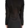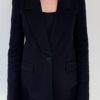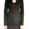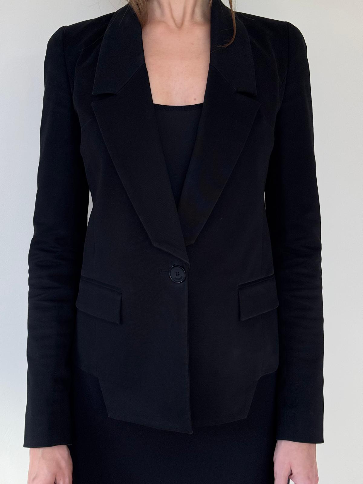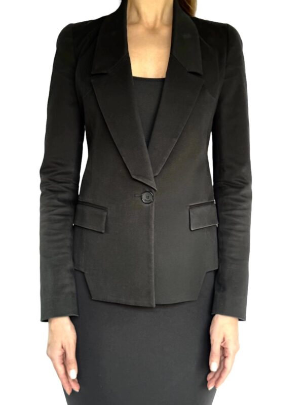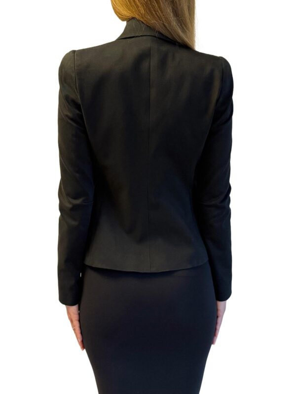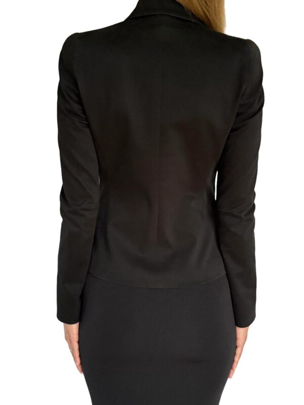 Klasyczny czarny żakiet o przedłużonym przodzie, idealnie wytaliowany. W ramionach wszyte poduszki.
