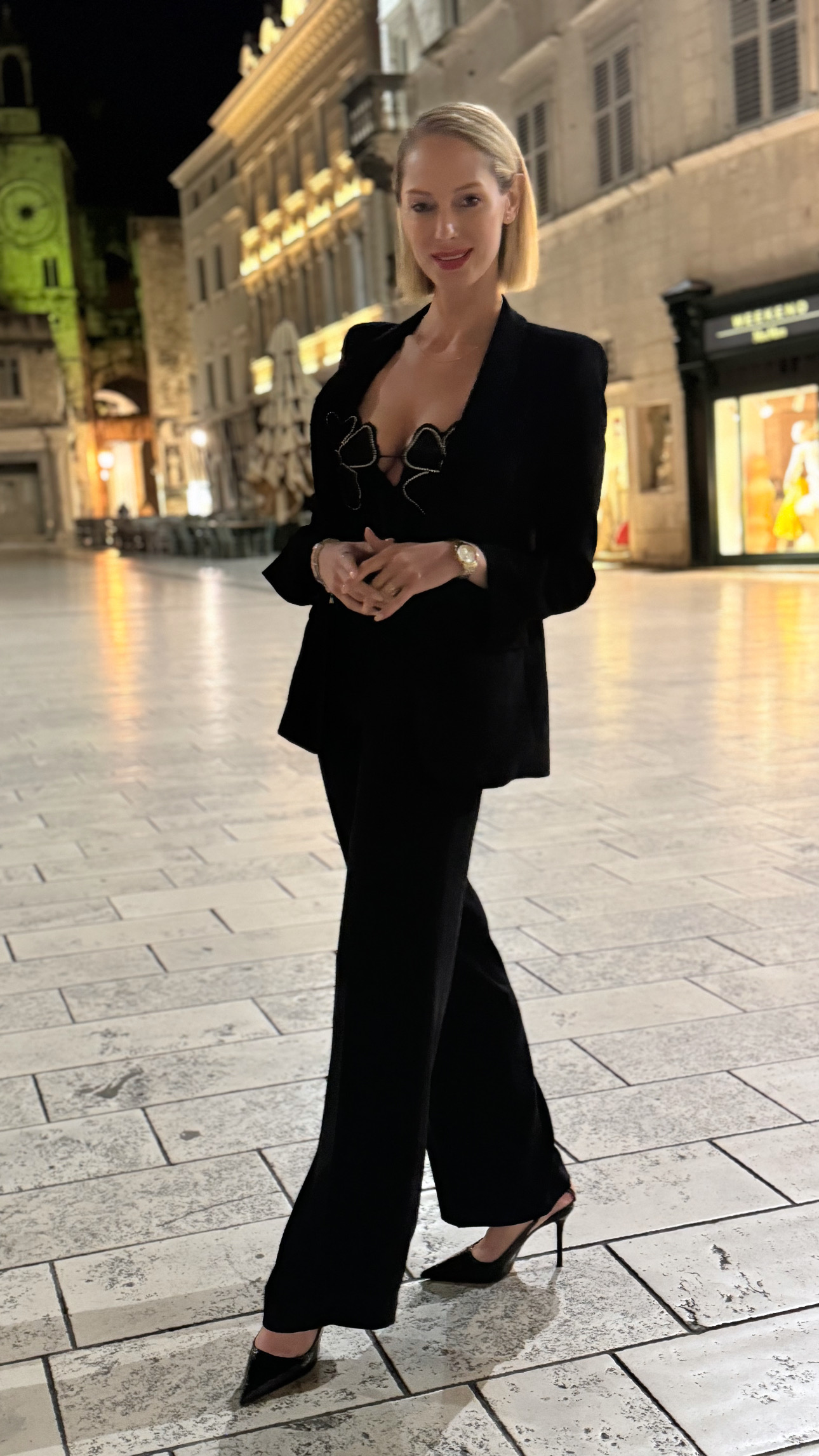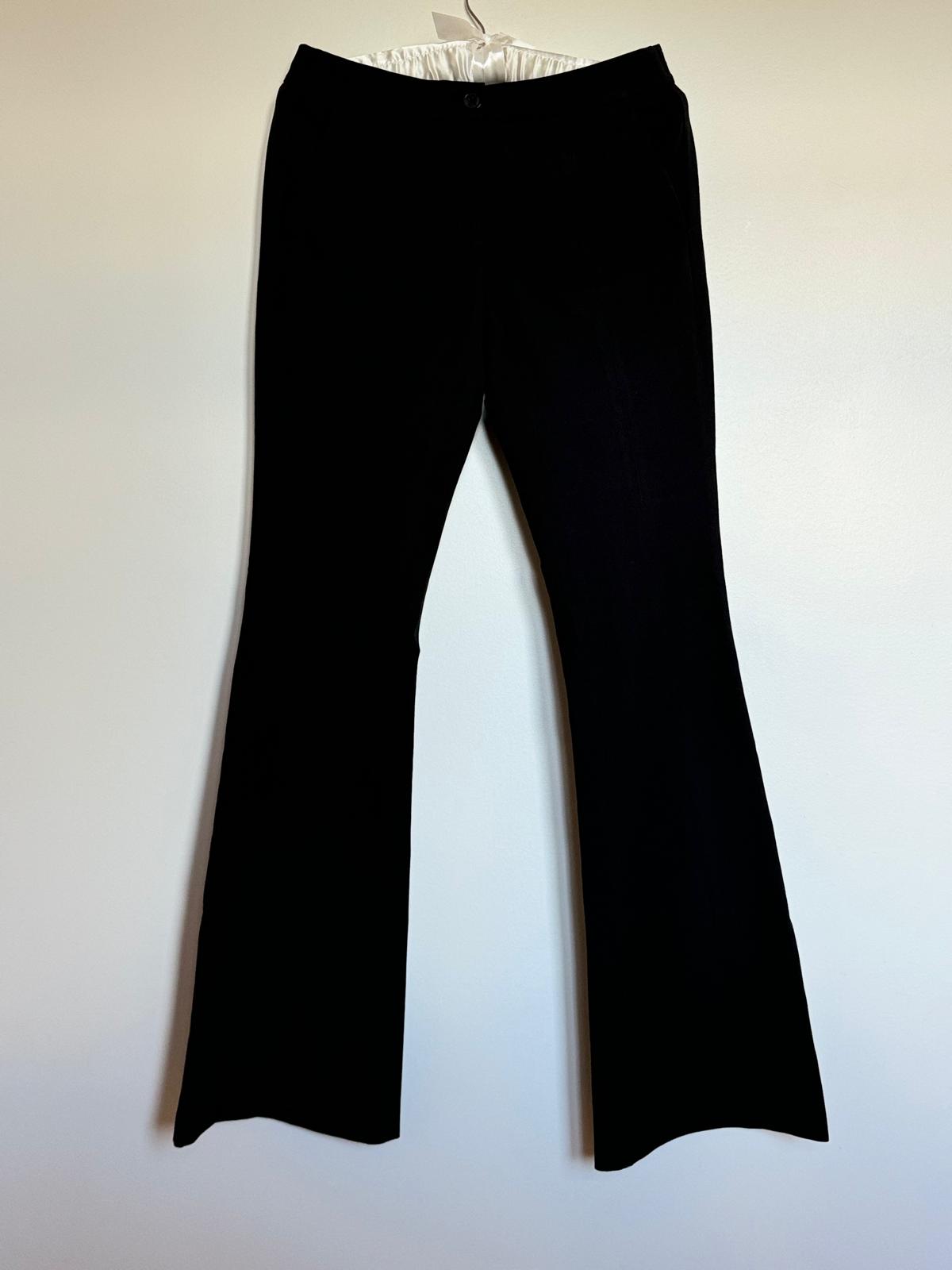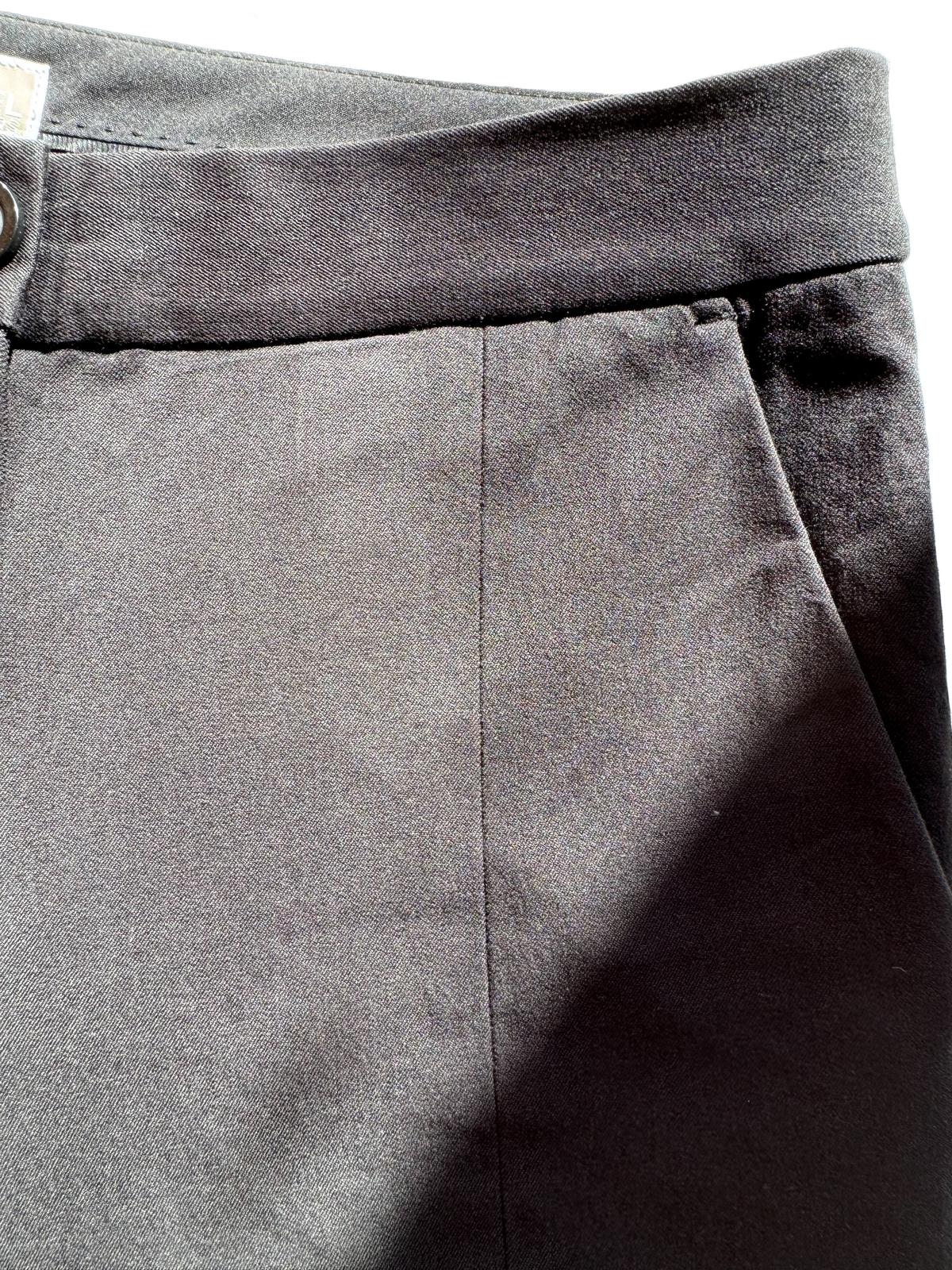 Klasyczne czarne spodnie o wydłużonej sylwetce. Wykończone dopasowanymi detalami, takimi jak środkowe szwy z przodu i wpuszczane kieszenie boczne. Model wykonany z gładkiego materiału. Elastyczna listwa w pasie, zapinana na guziczek.