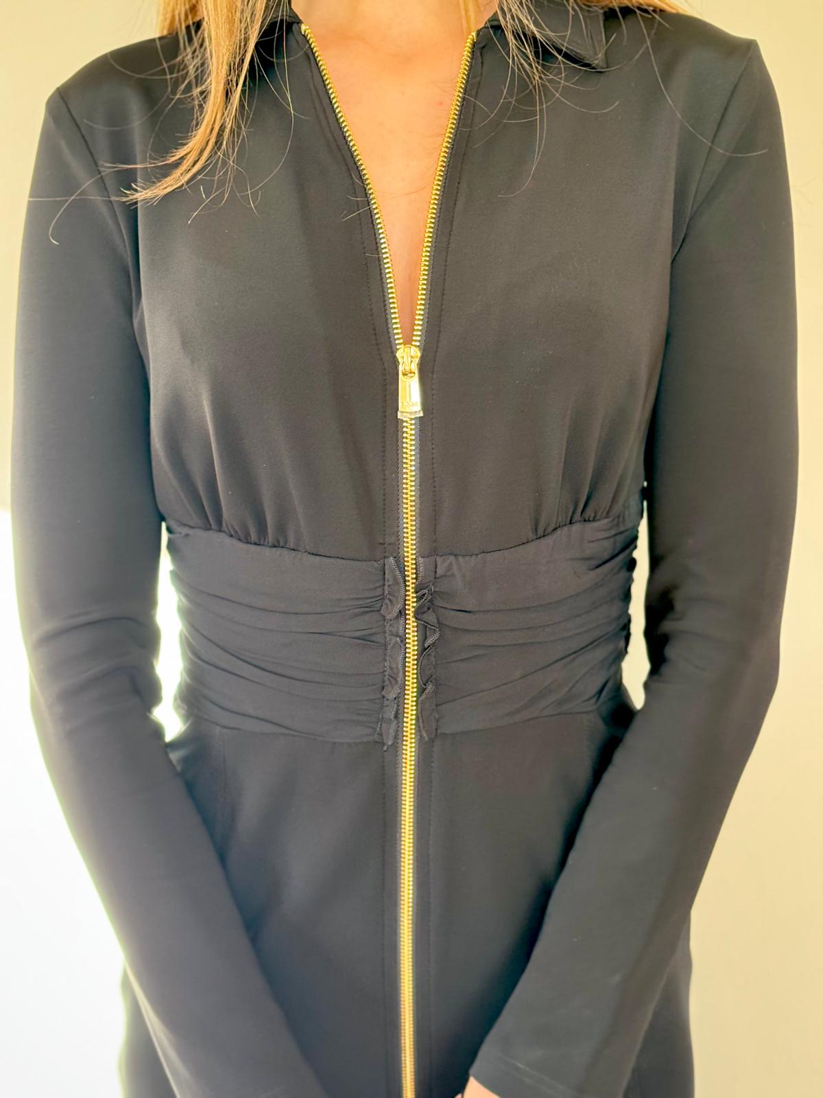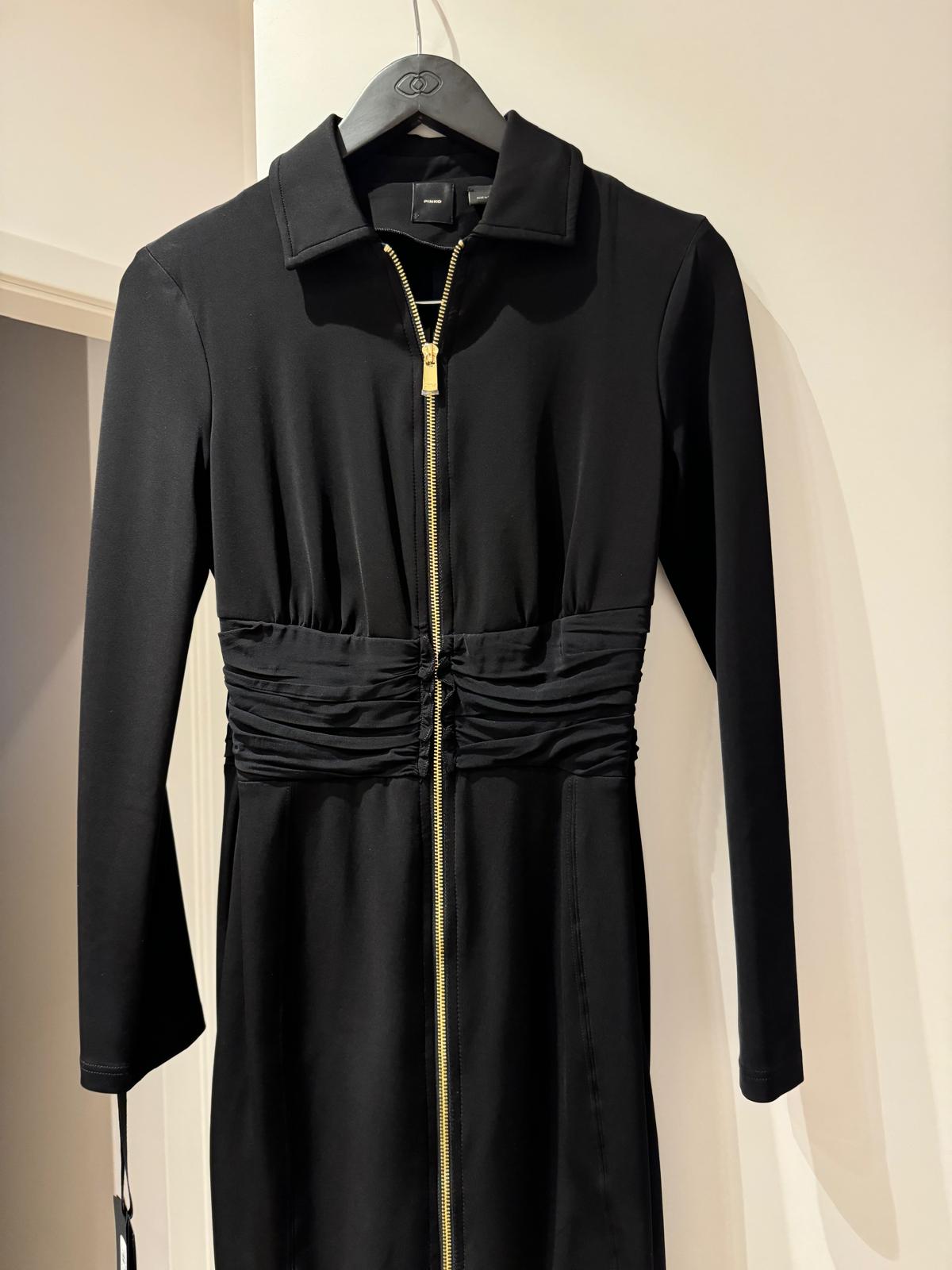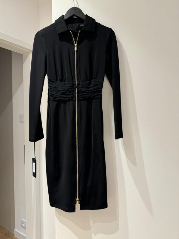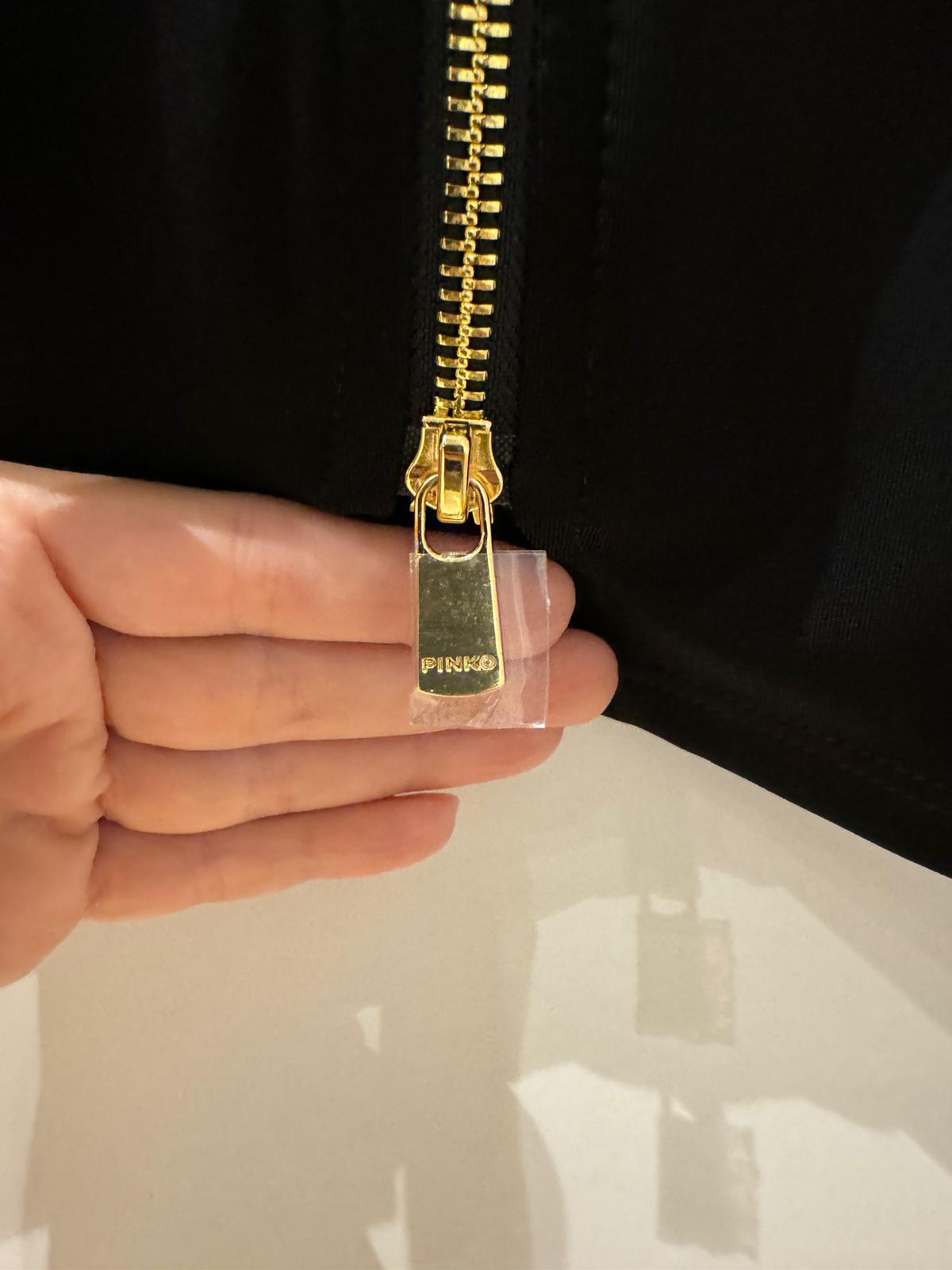 Przedstawiamy czarną sukienkę przed kolano marki PINKO, ozdobioną złotym suwakiem i drapowaniem w talii, co idealnie podkreśla sylwetkę.