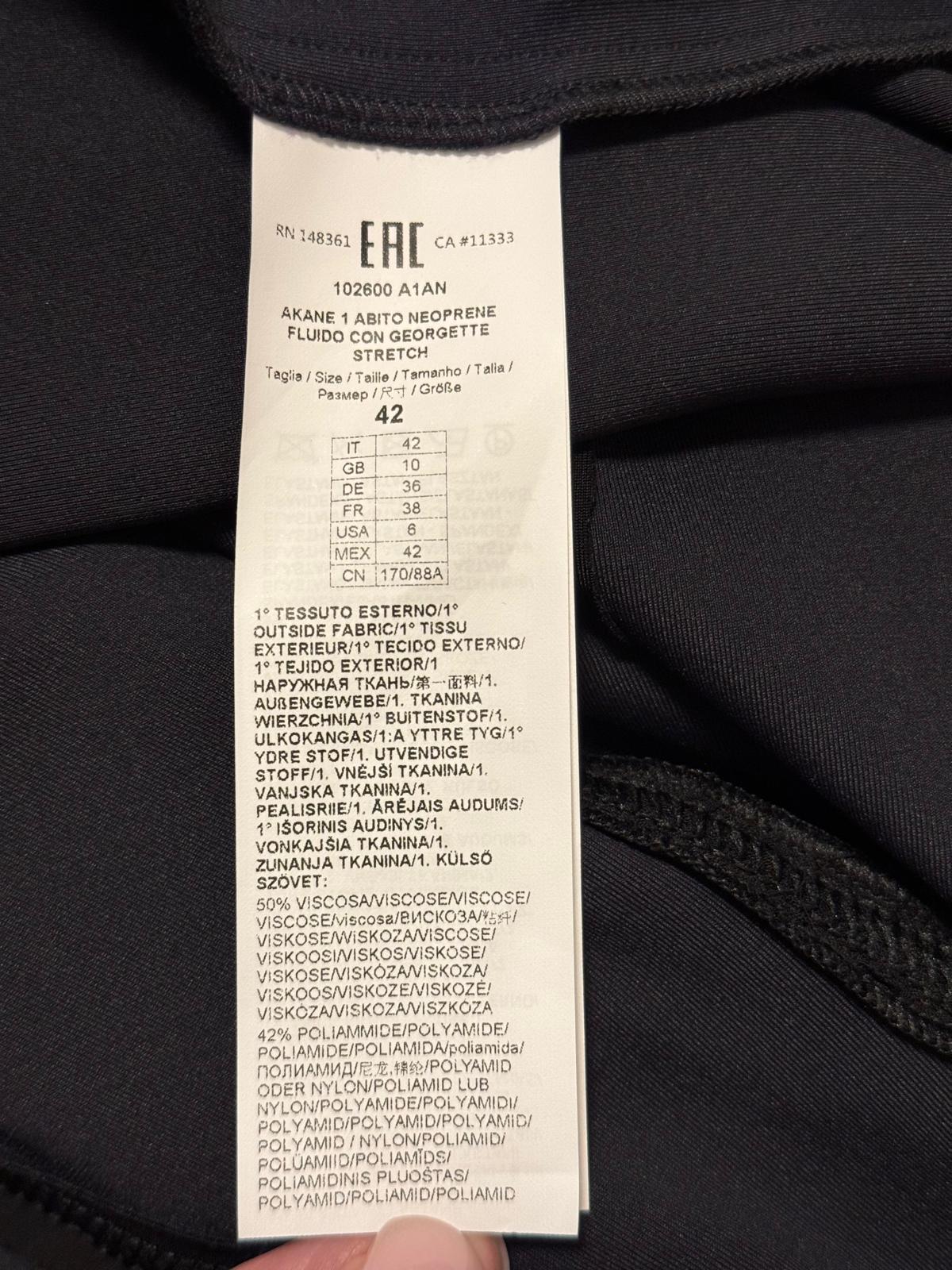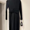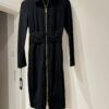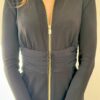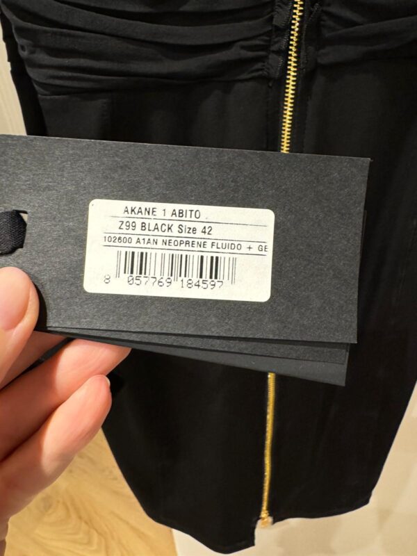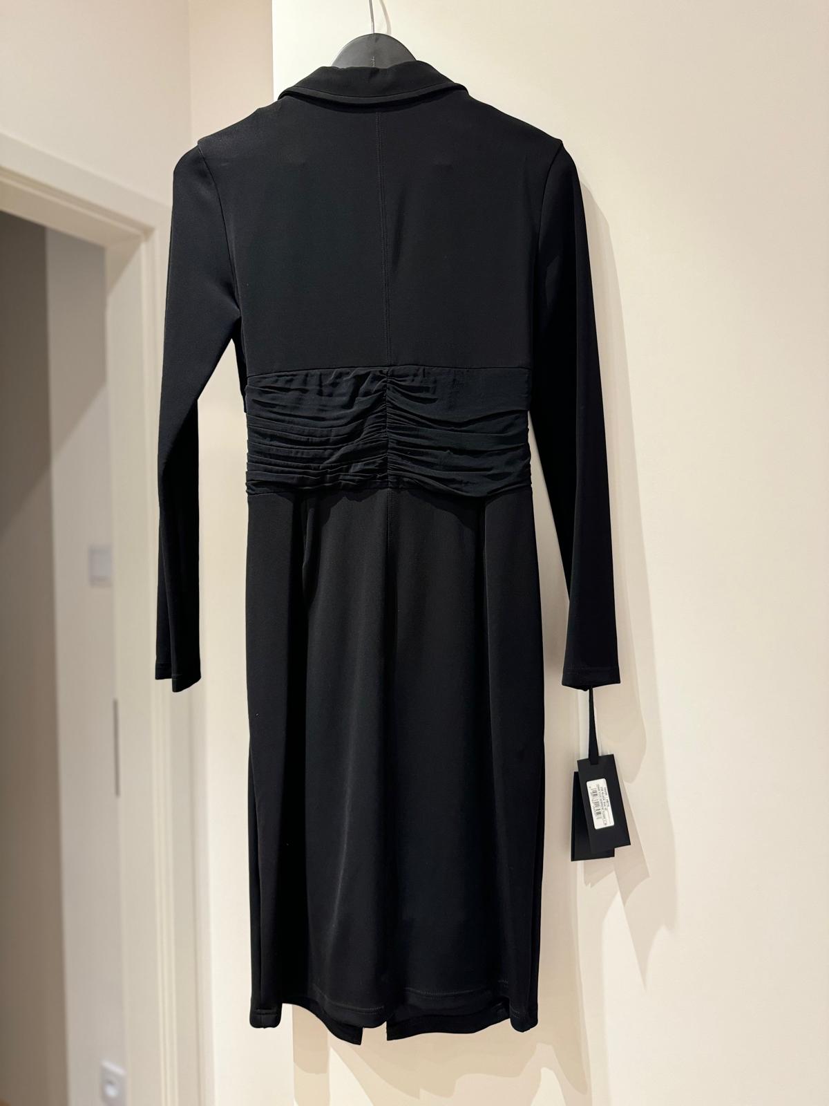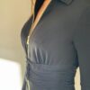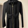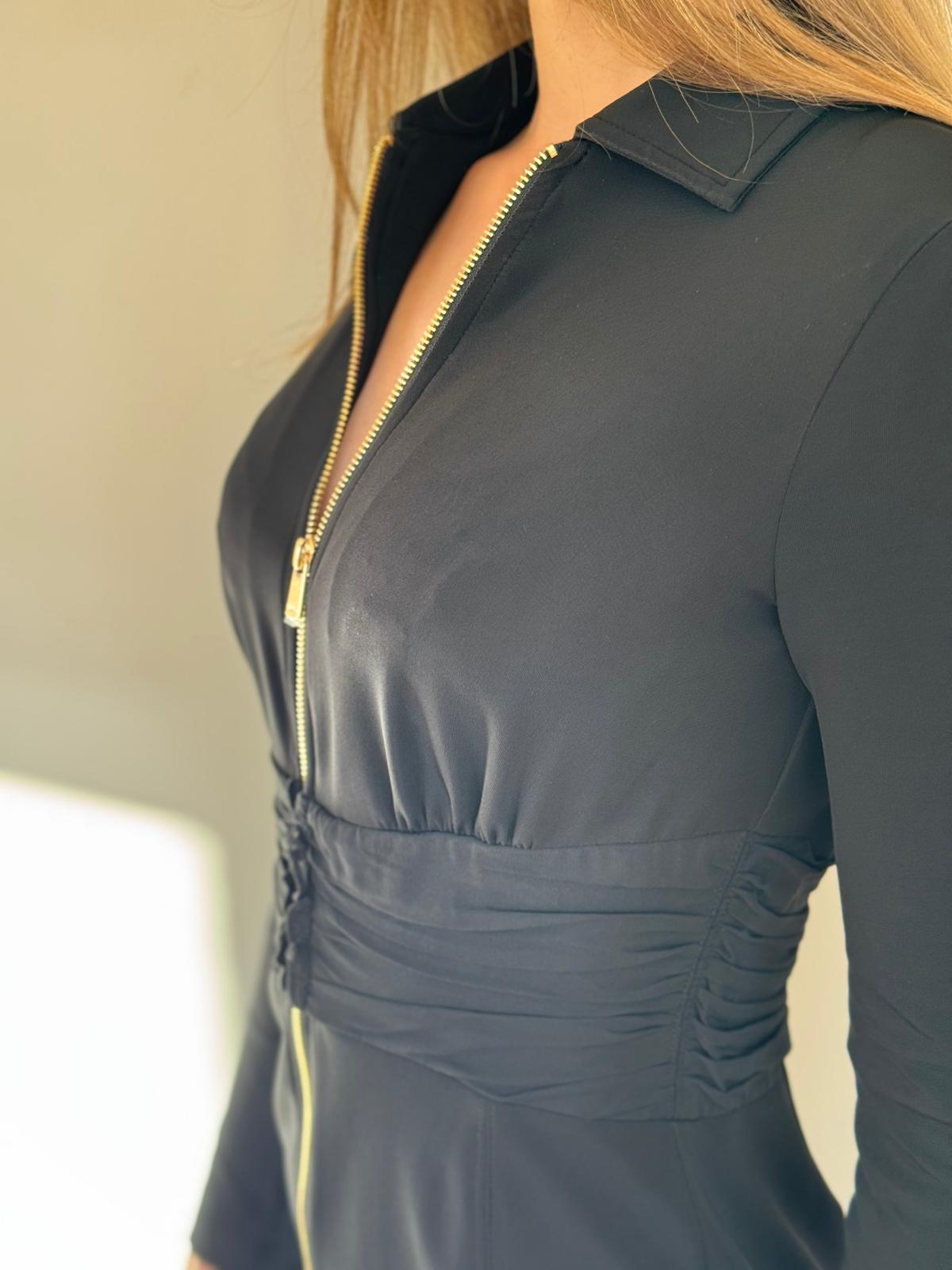 Przedstawiamy czarną sukienkę przed kolano marki PINKO, ozdobioną złotym suwakiem i drapowaniem w talii, co idealnie podkreśla sylwetkę.