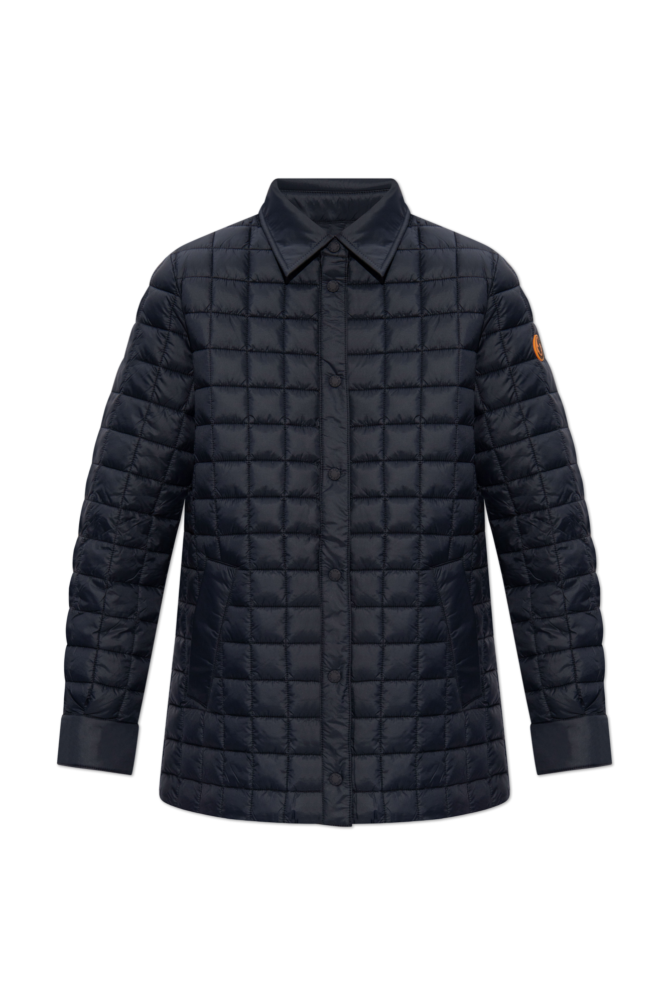 Zamknięcie na guziki, ukryte pod elegancką listwą maskującą oraz długie rękawy z możliwością odwrócenia mankietów, ujawniające kontrastujący materiał, podkreślają unikatowy design. Dodatkowo, okrągła naszywka z logo marki w kolorze pomarańczowym, umieszczona na lewym rękawie, dodaje kurtce charakteru i rozpoznawalności.