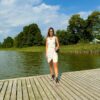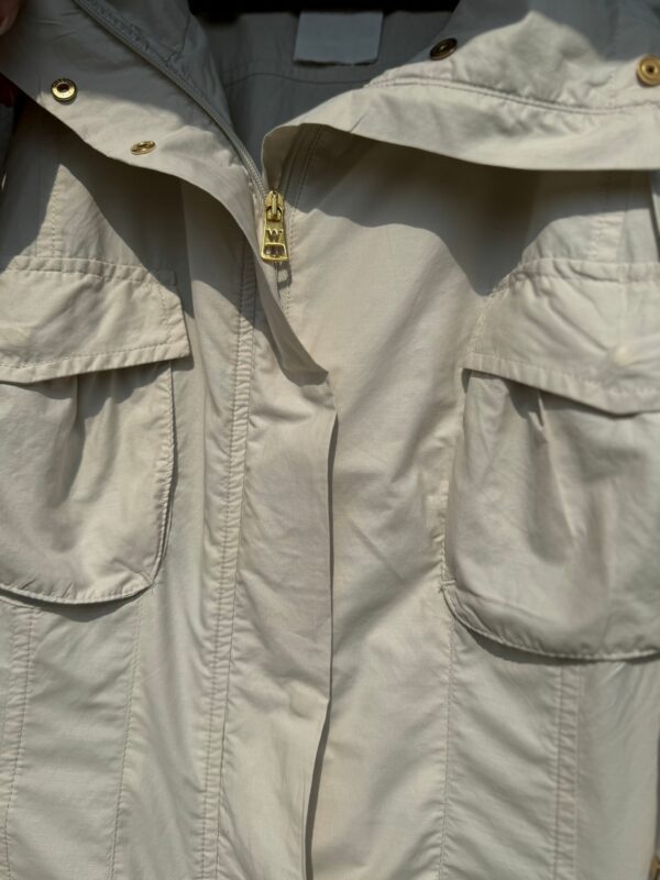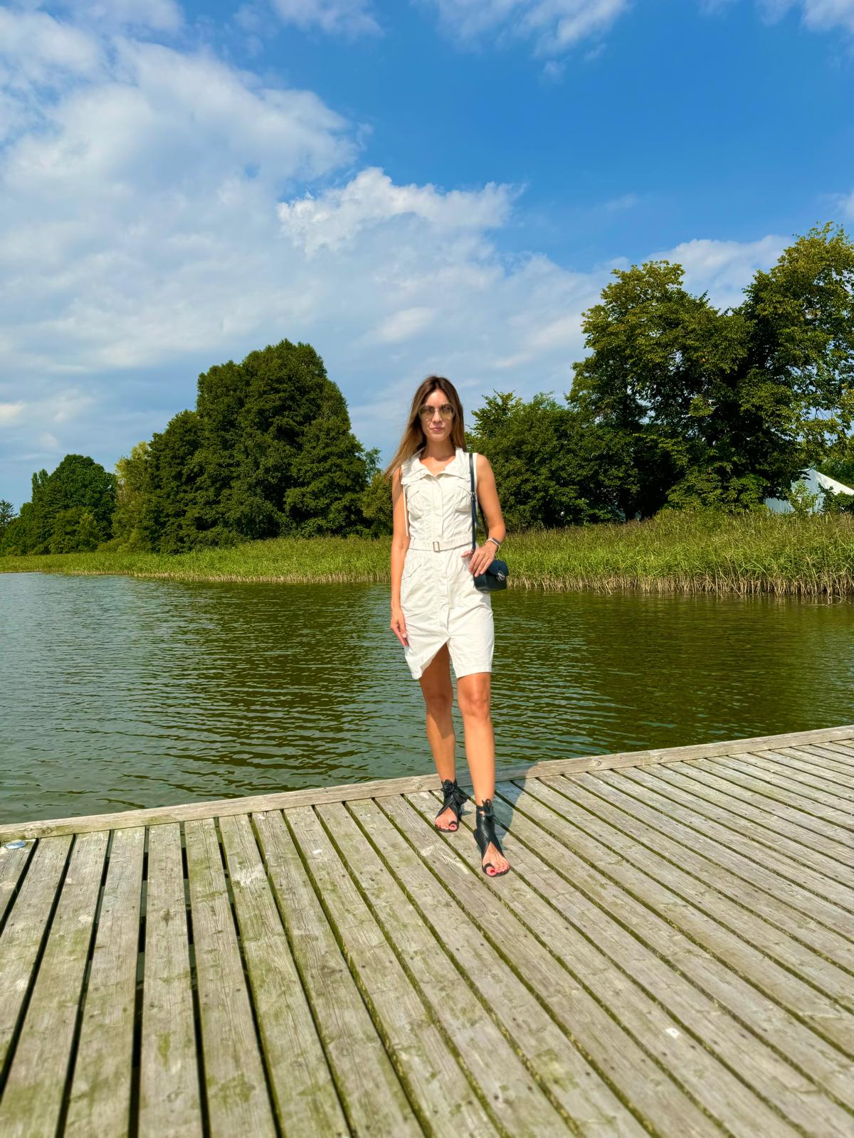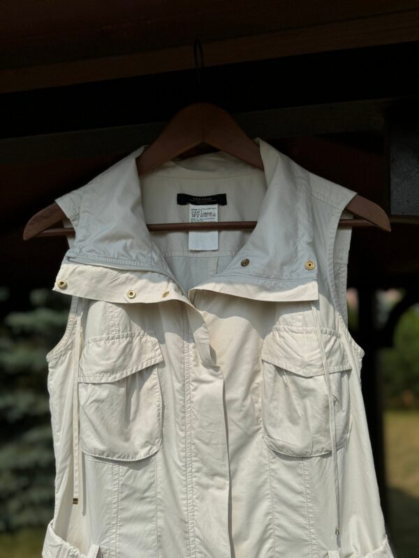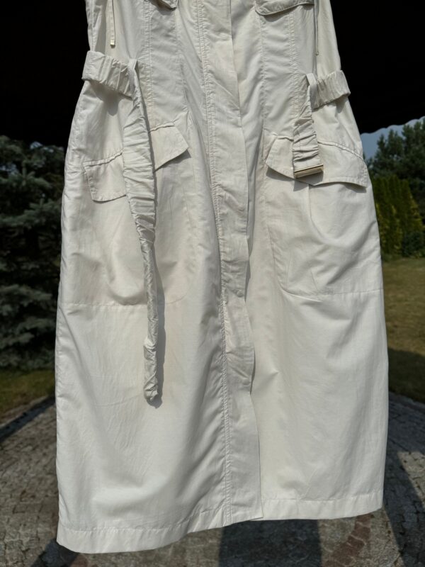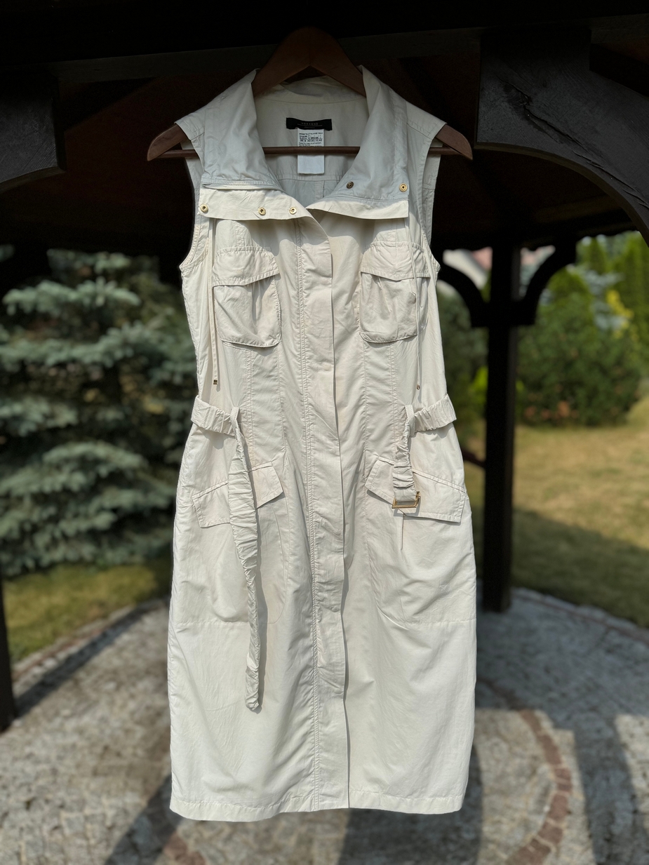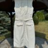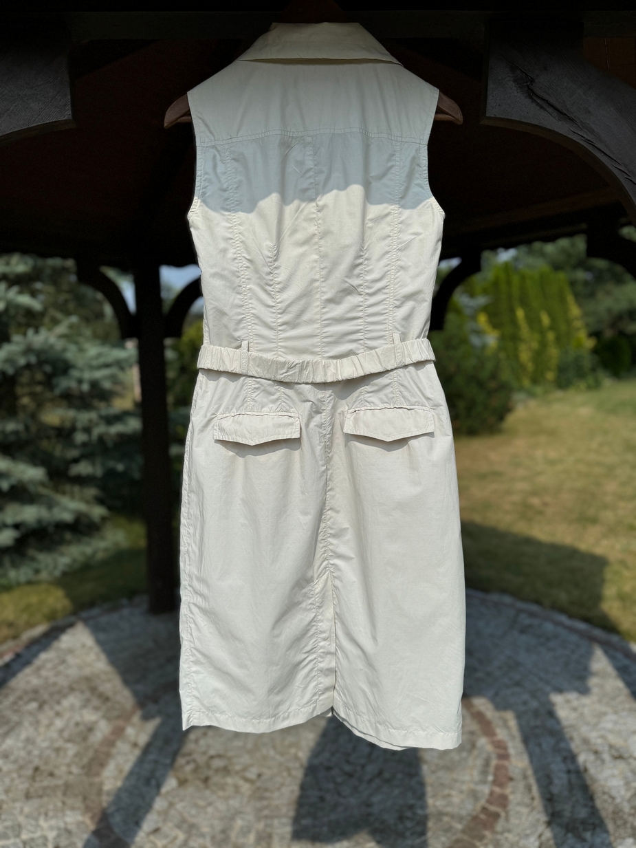 Idealnie skrojona letnia sukienka w kolorze piaskowym (w kolorze Sahara). Rozpinana z przodu na kryty suwak.