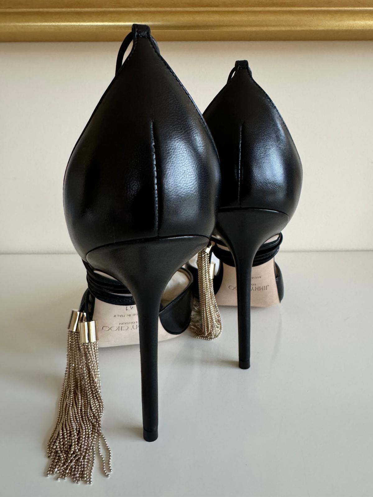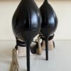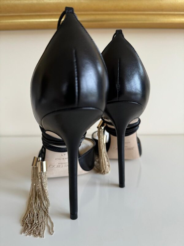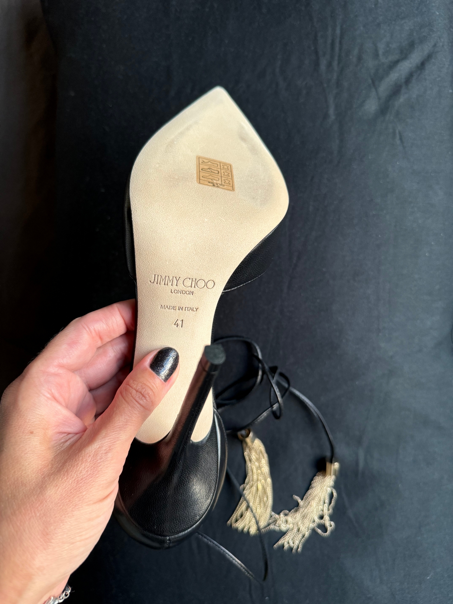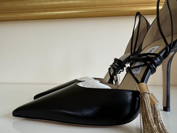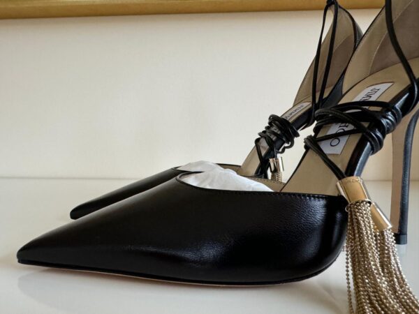 Odważne i wyraziste czółenka „ERIS” zostały wykonane we Włoszech z czarnej skóry nappa. Skórzane paski zmysłowo owijają się wokół kostki, wykończone koralikami z frędzlami, które się lekko poruszają wraz z ruchem.