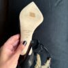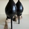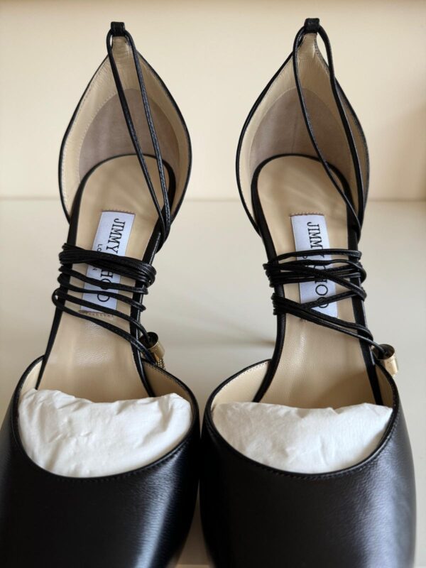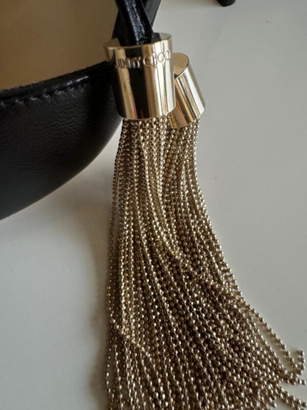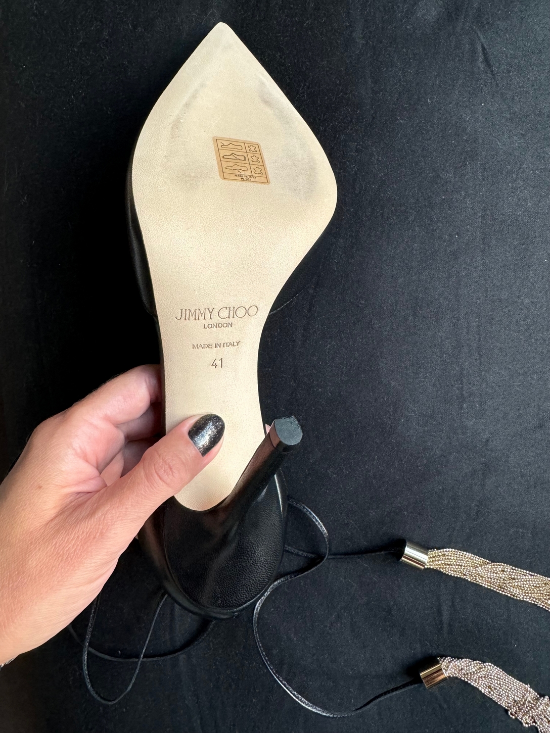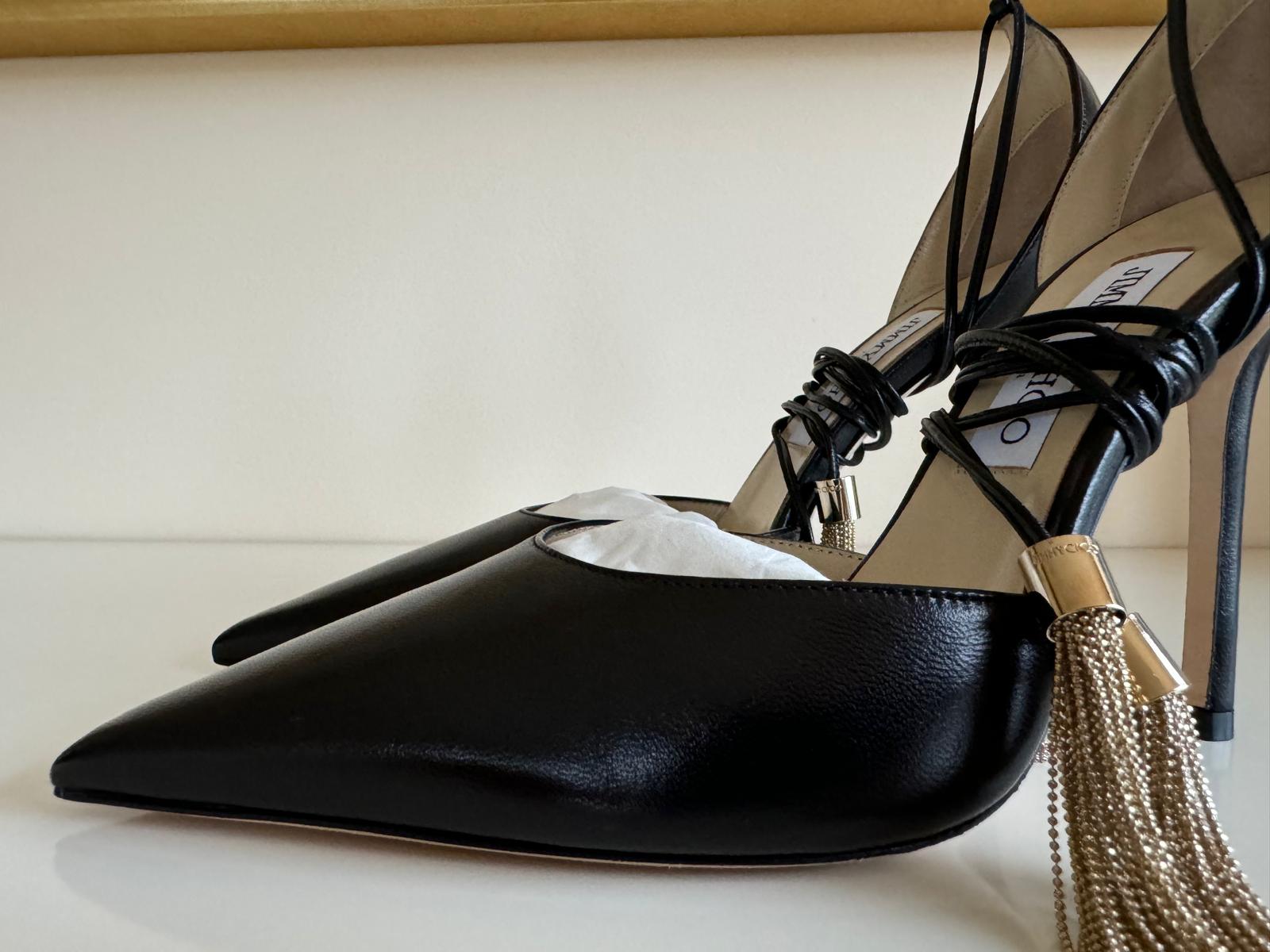 Odważne i wyraziste czółenka „ERIS” zostały wykonane we Włoszech z czarnej skóry nappa. Skórzane paski zmysłowo owijają się wokół kostki, wykończone koralikami z frędzlami, które się lekko poruszają wraz z ruchem.