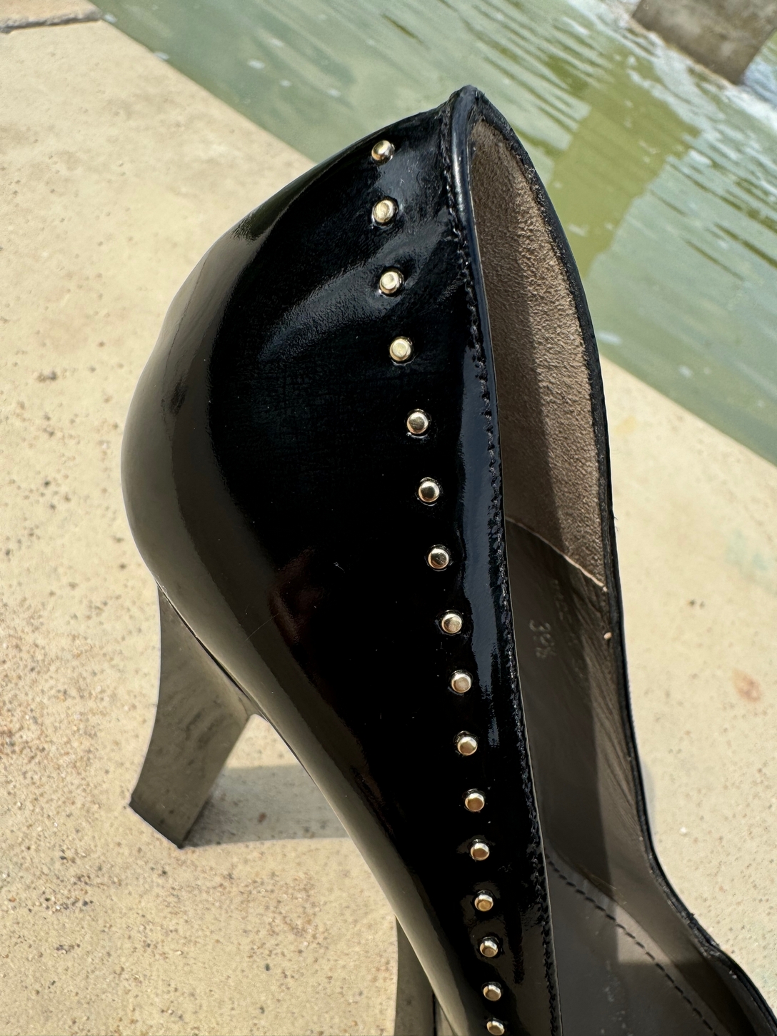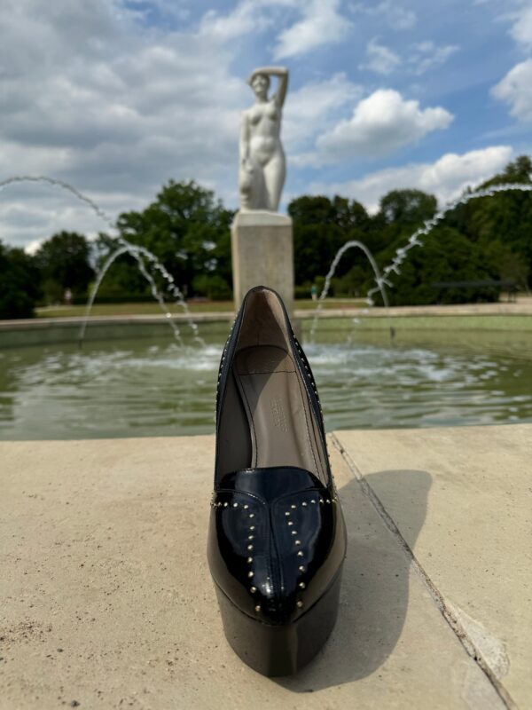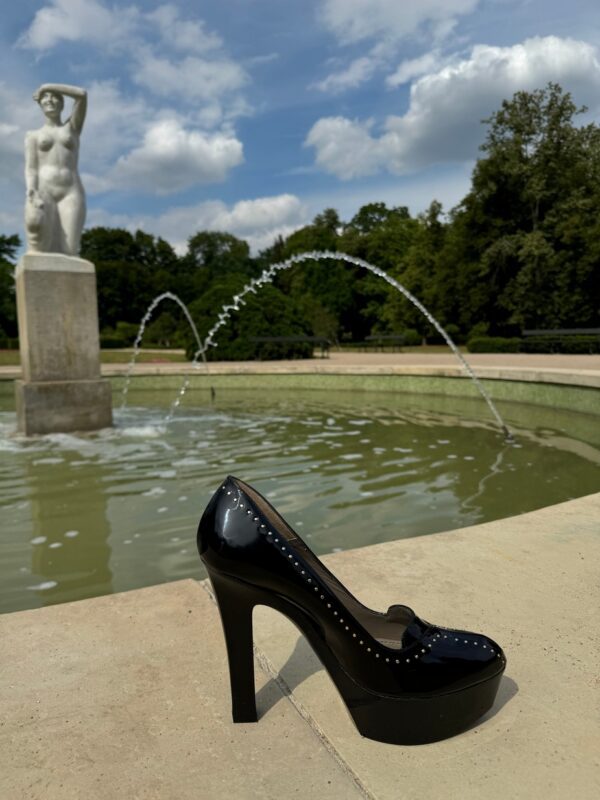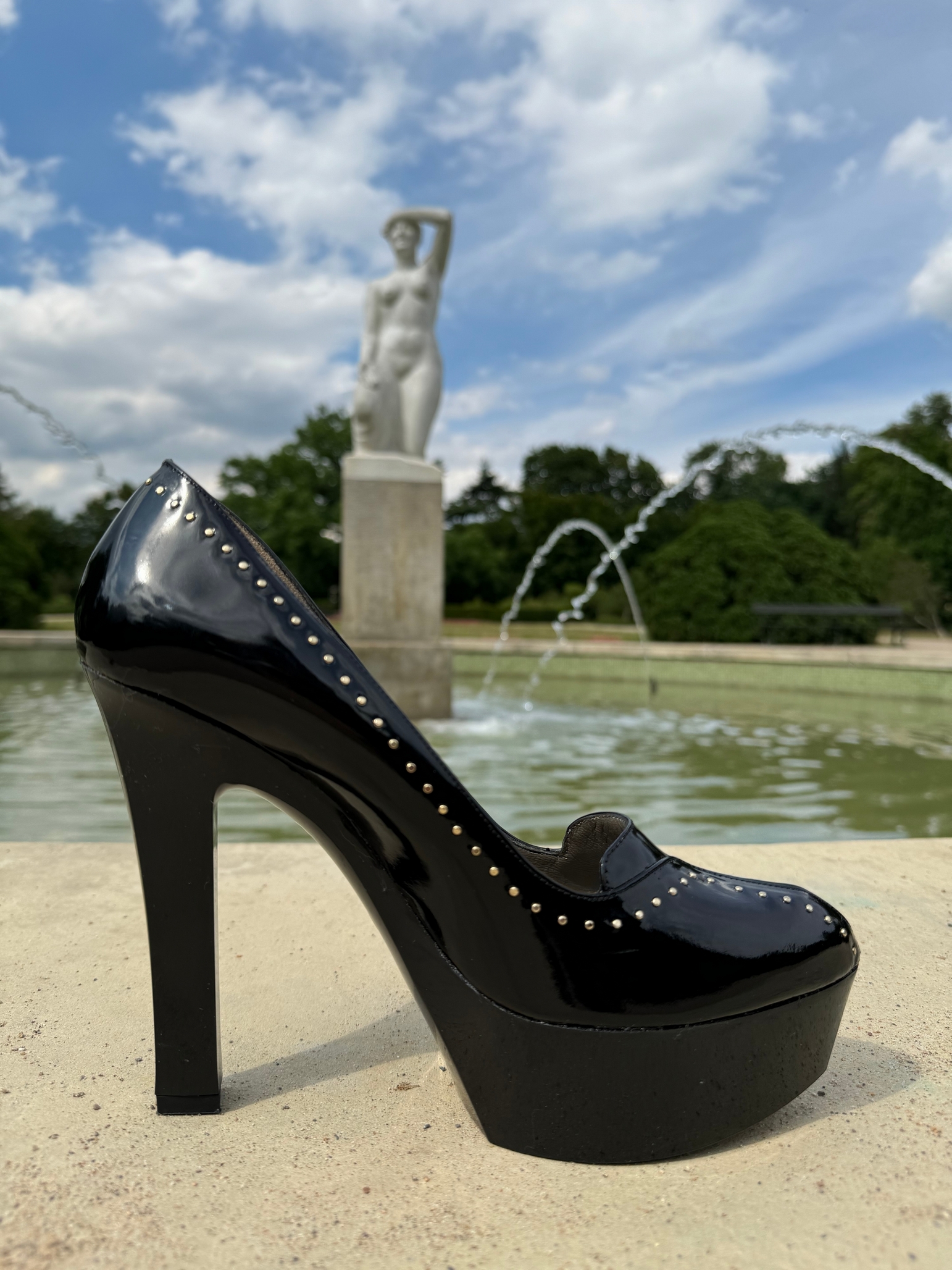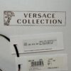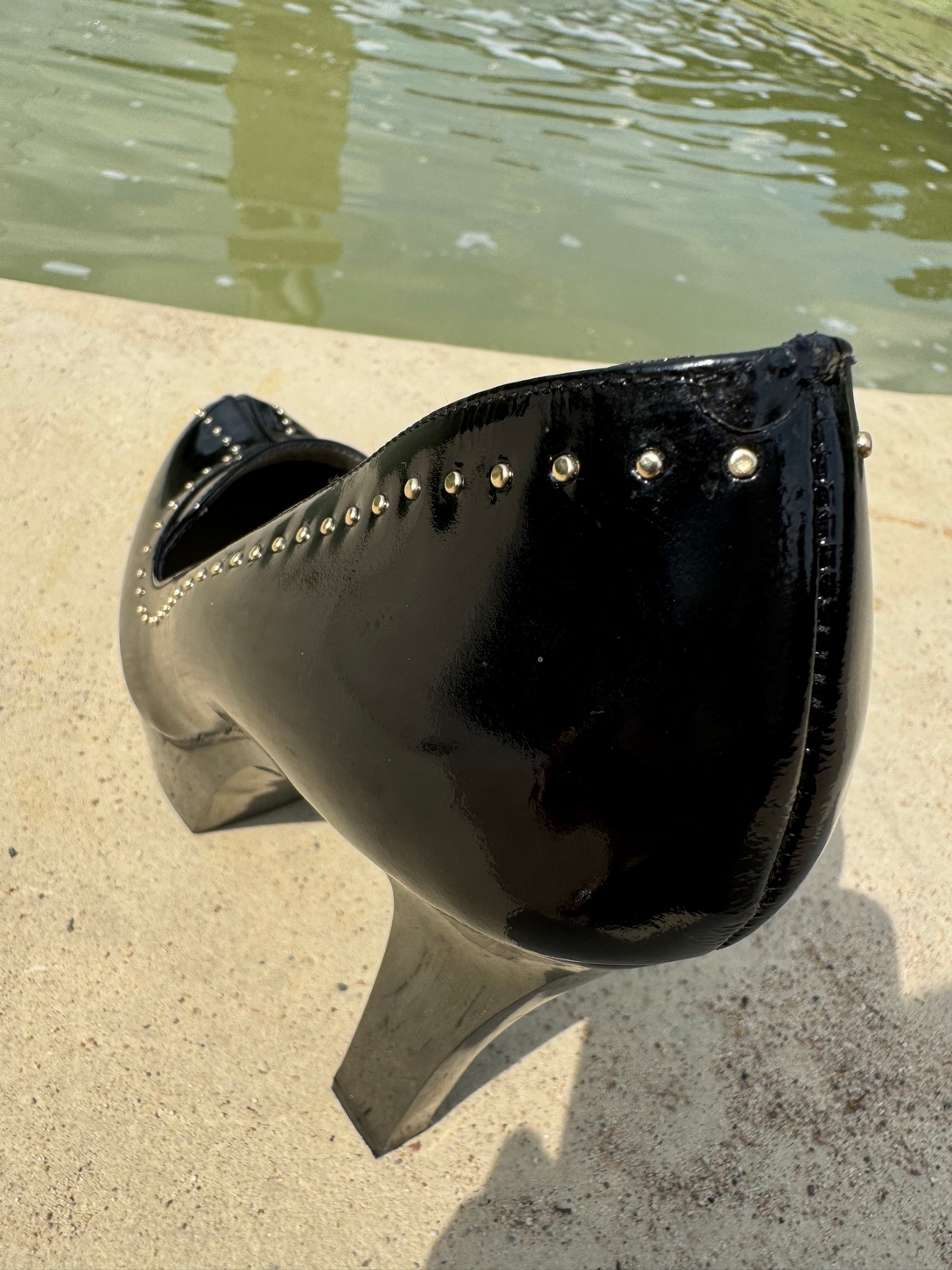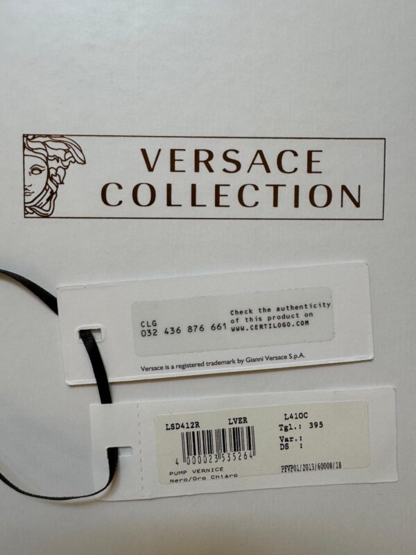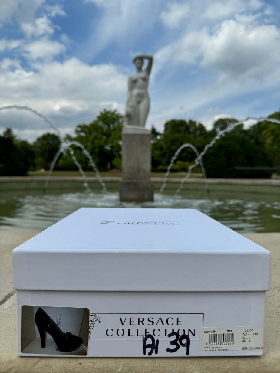 Unikatowe czółenka od Versace Collection, z nadbudowanym noskiem. Wzdłuż stopy, ozdobione złotymi dżetami.