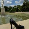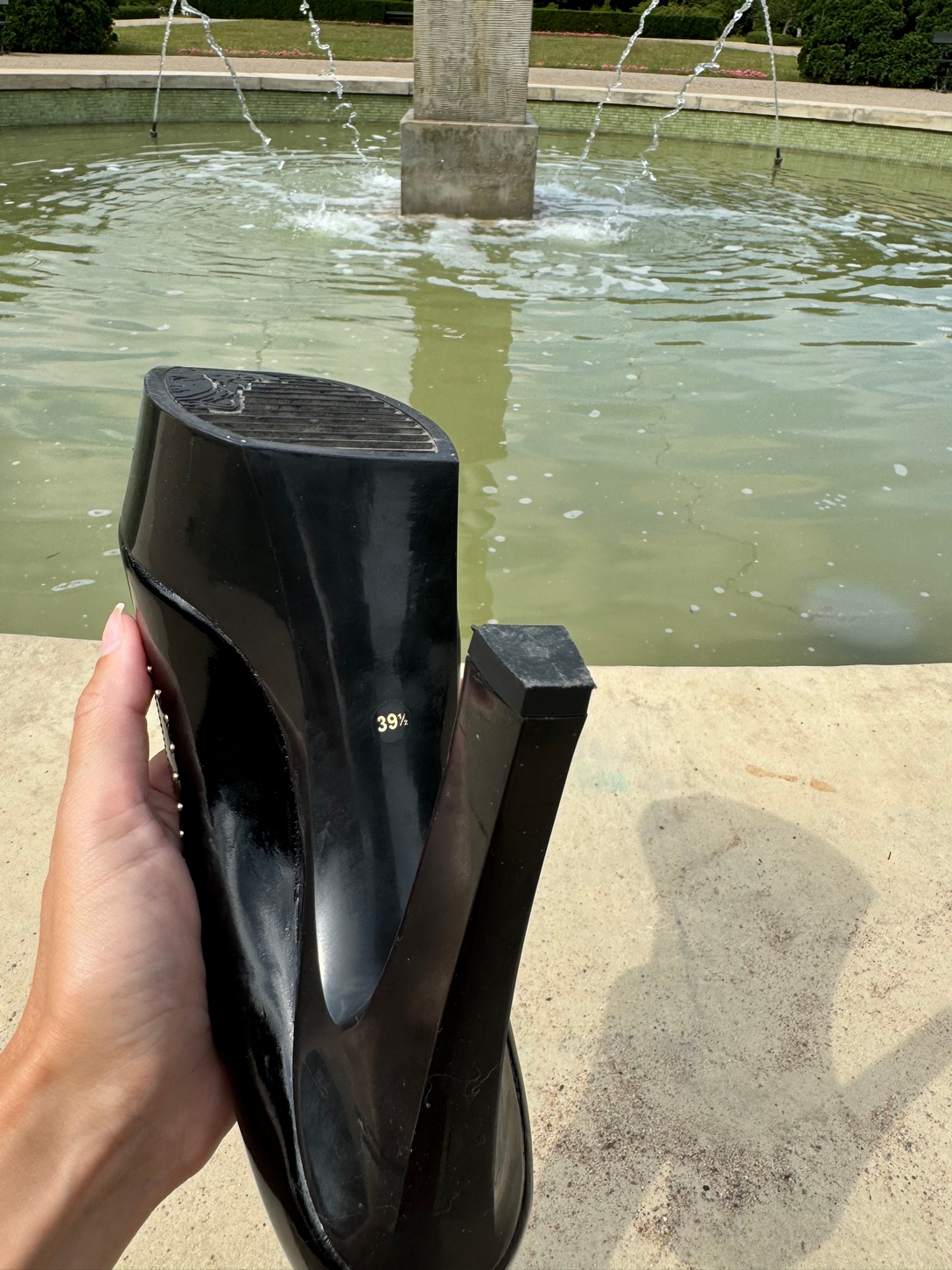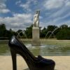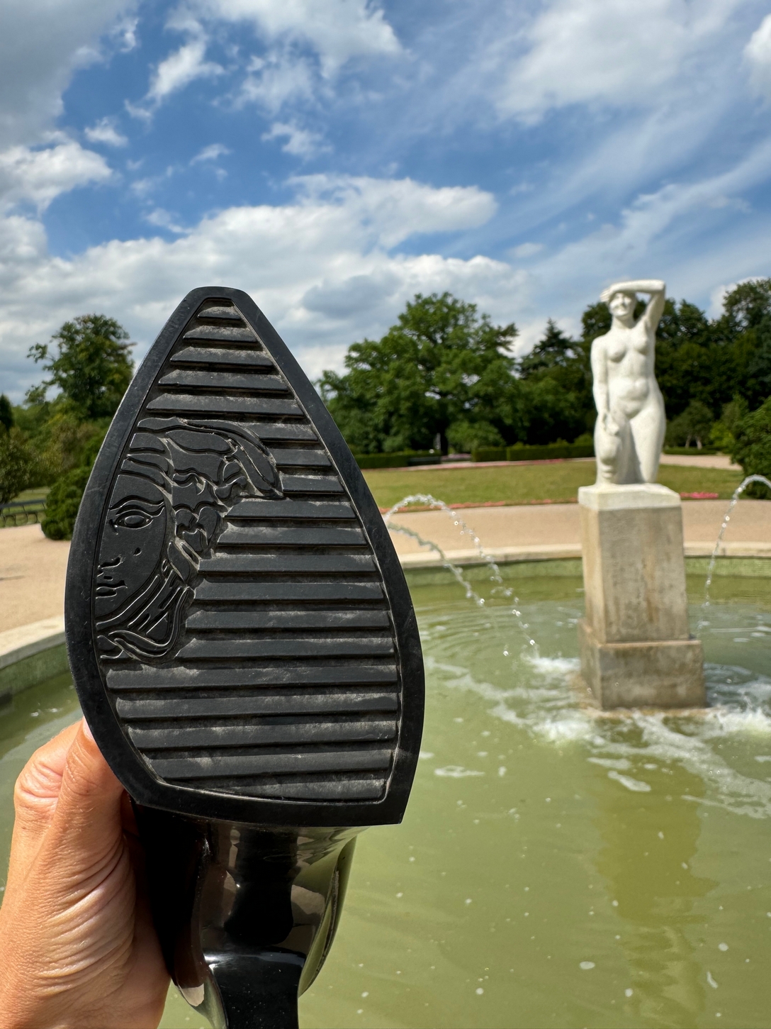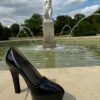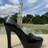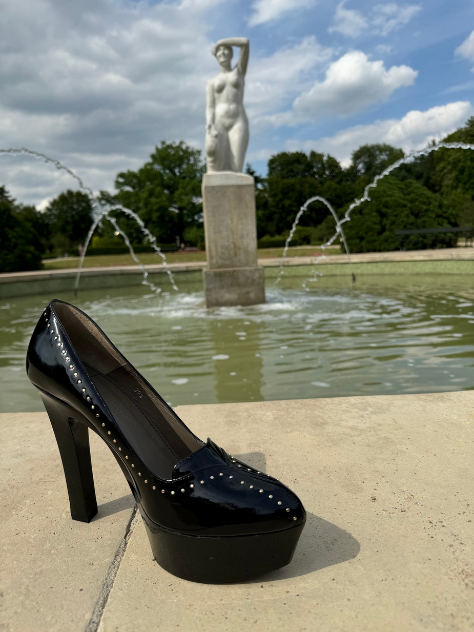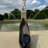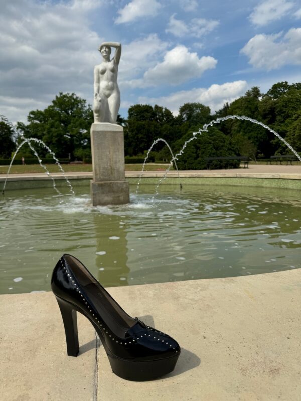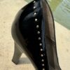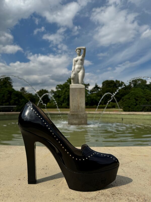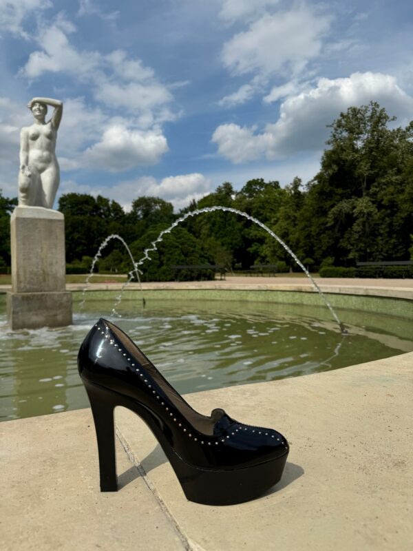 Unikatowe czółenka od Versace Collection, z nadbudowanym noskiem. Wzdłuż stopy, ozdobione złotymi dżetami.
